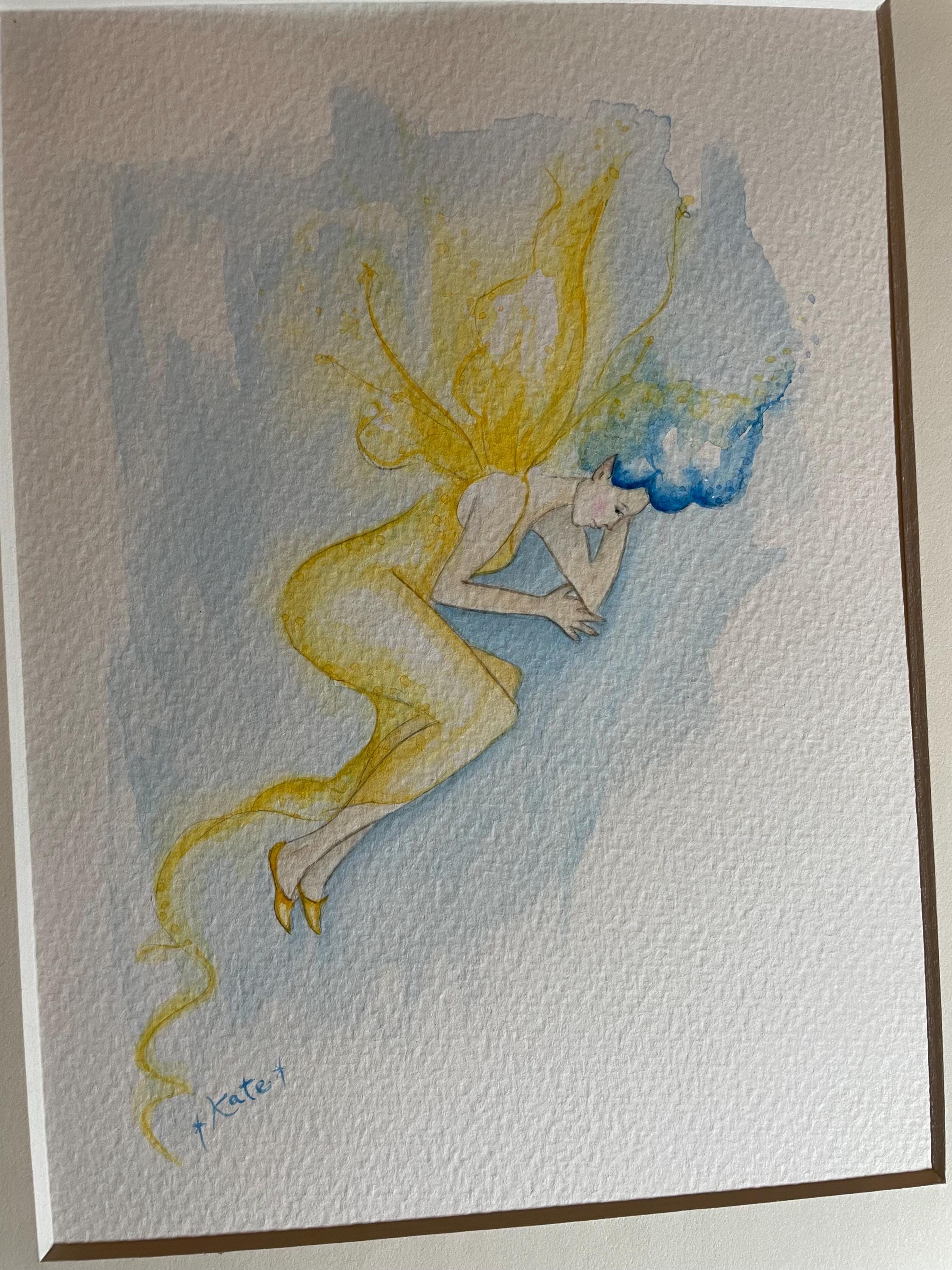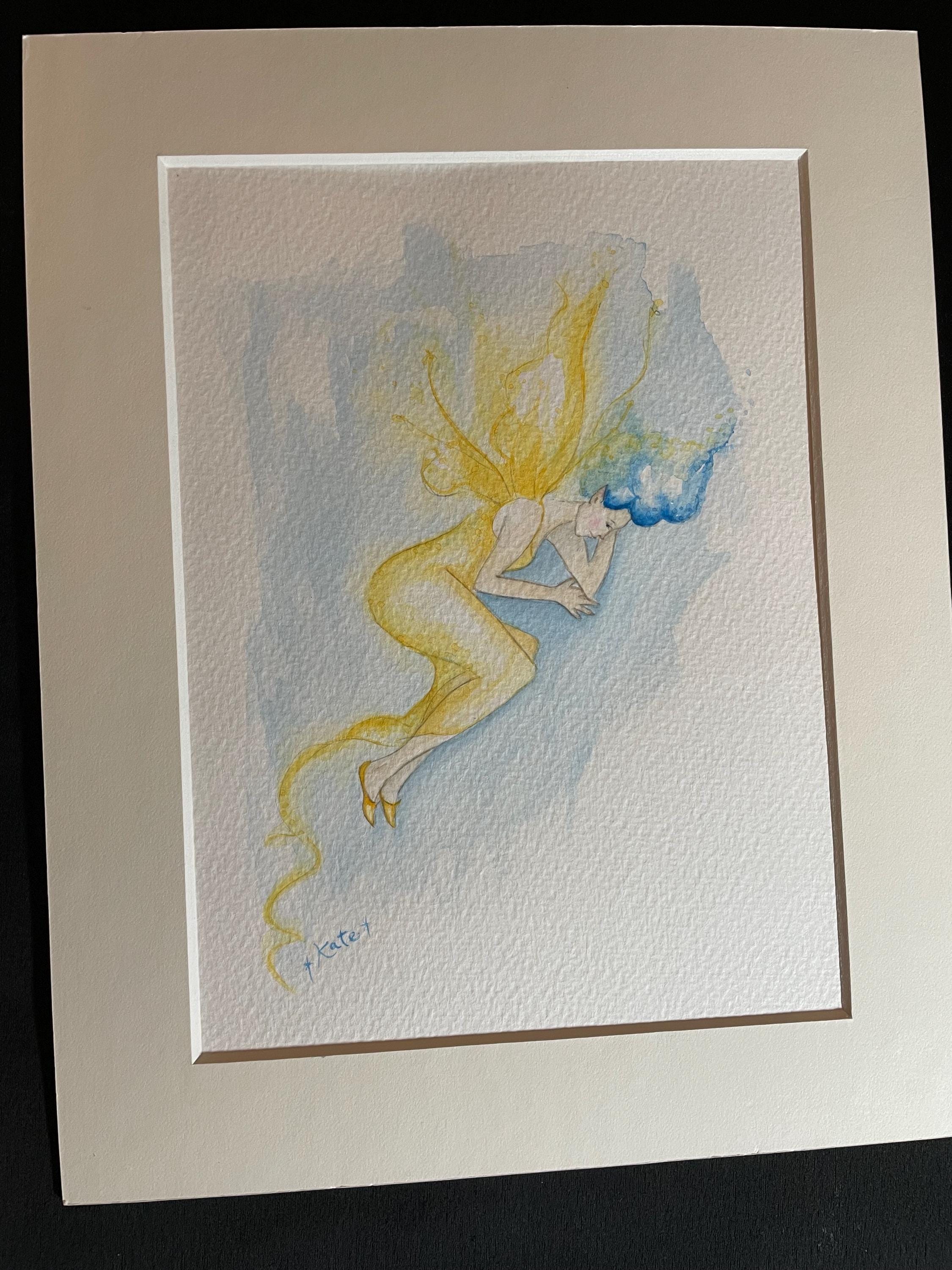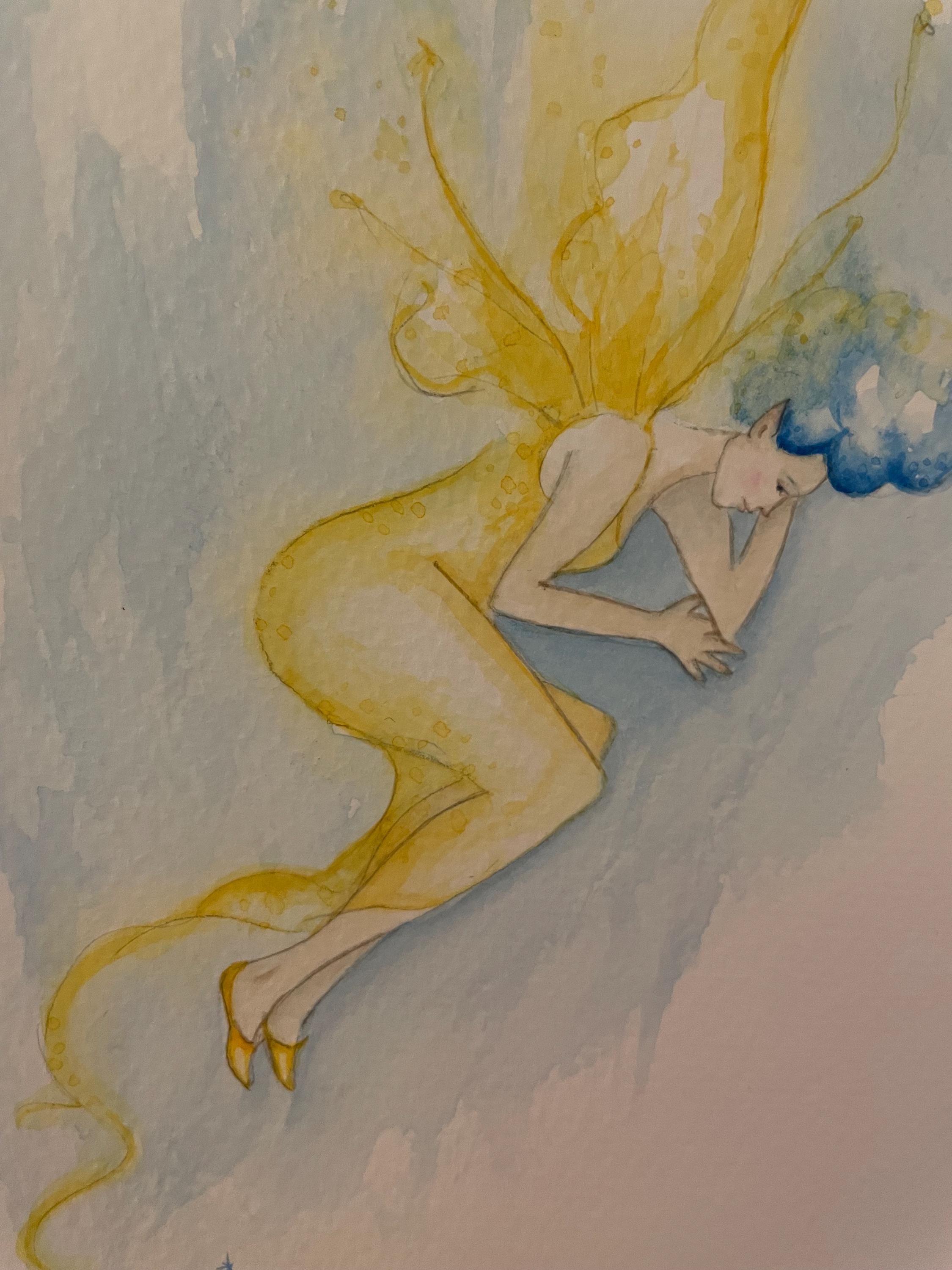A sleeping fairy the colour of Topaz with beautiful blue hair
