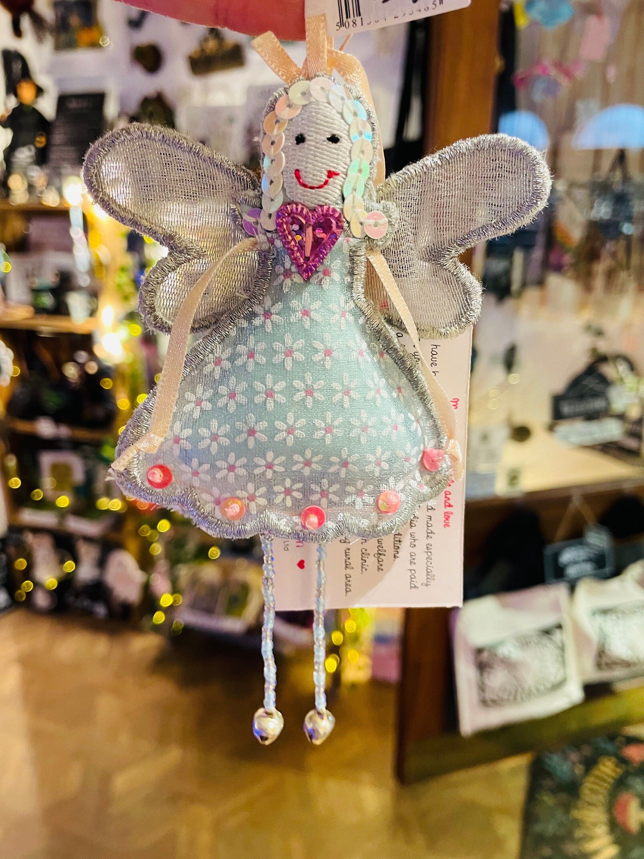 Gorgeous fairy with a light blue organza dress printed with white daisies, a pink heart sequin, blue and silver beaded legs and silver tinkling bell feet!