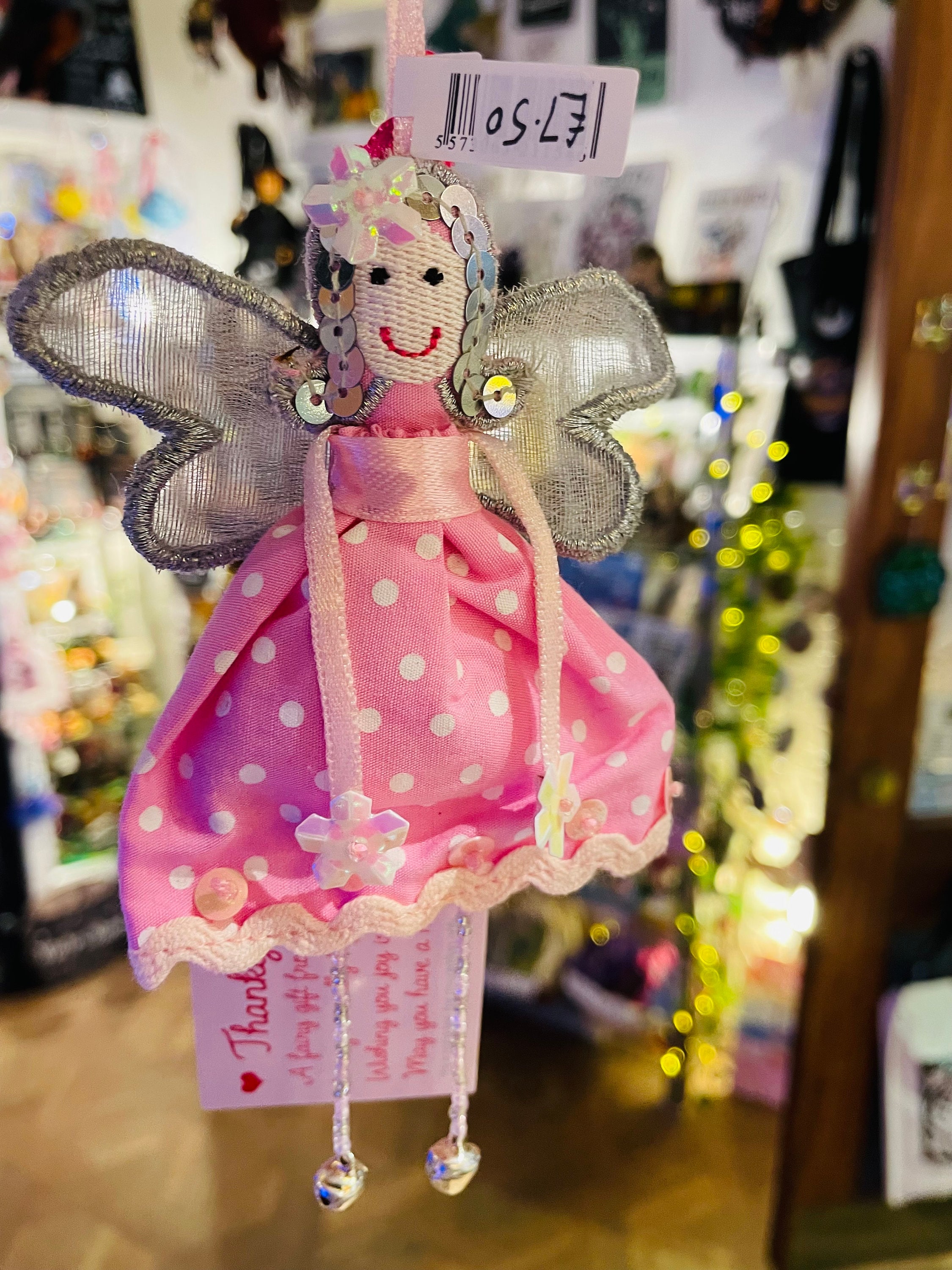 A pretty fairy with pink spotty cotton dress, pink rick rack trim, beaded legs, tinkling bell feet and sequin flowers in her hands and her hair.