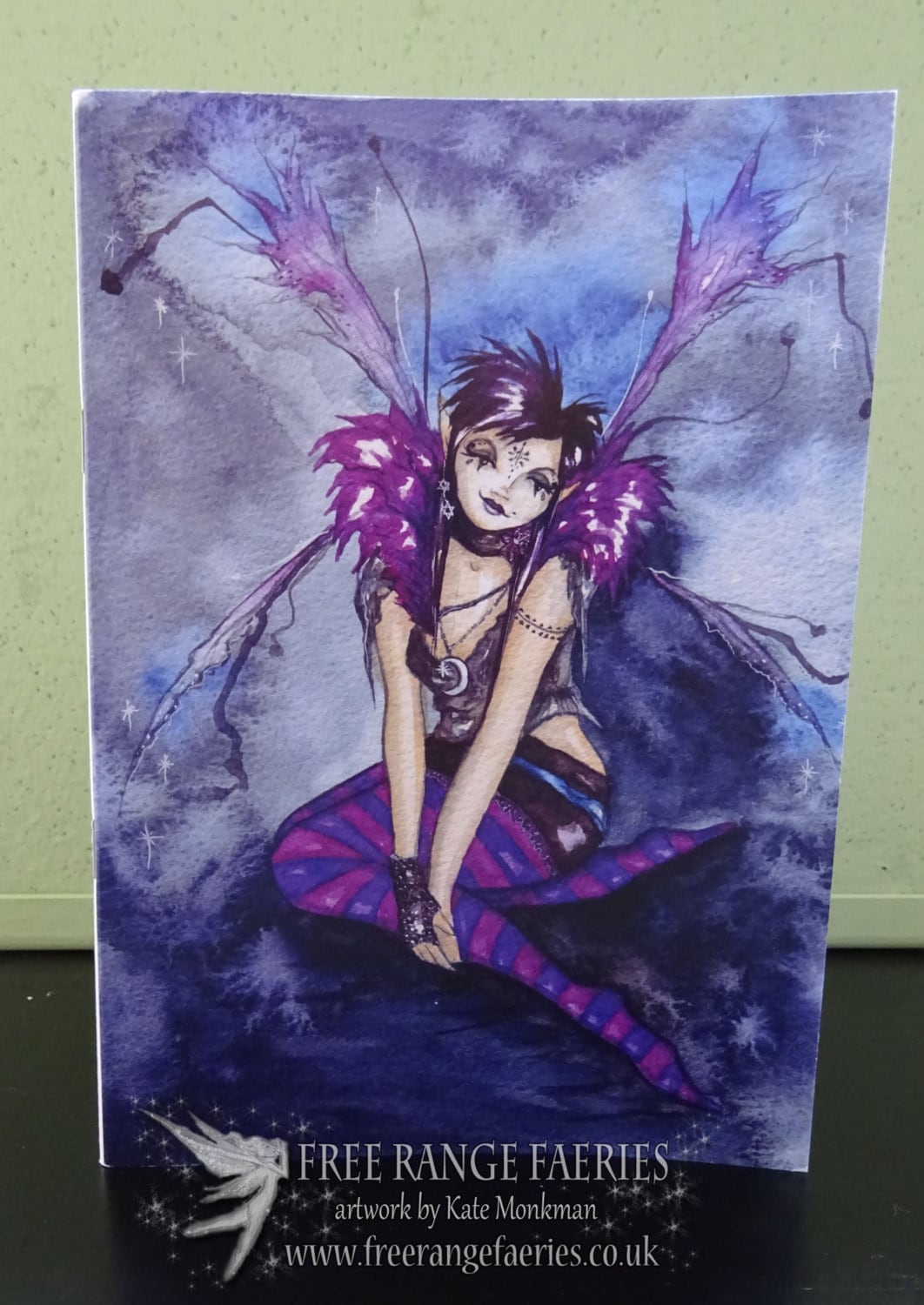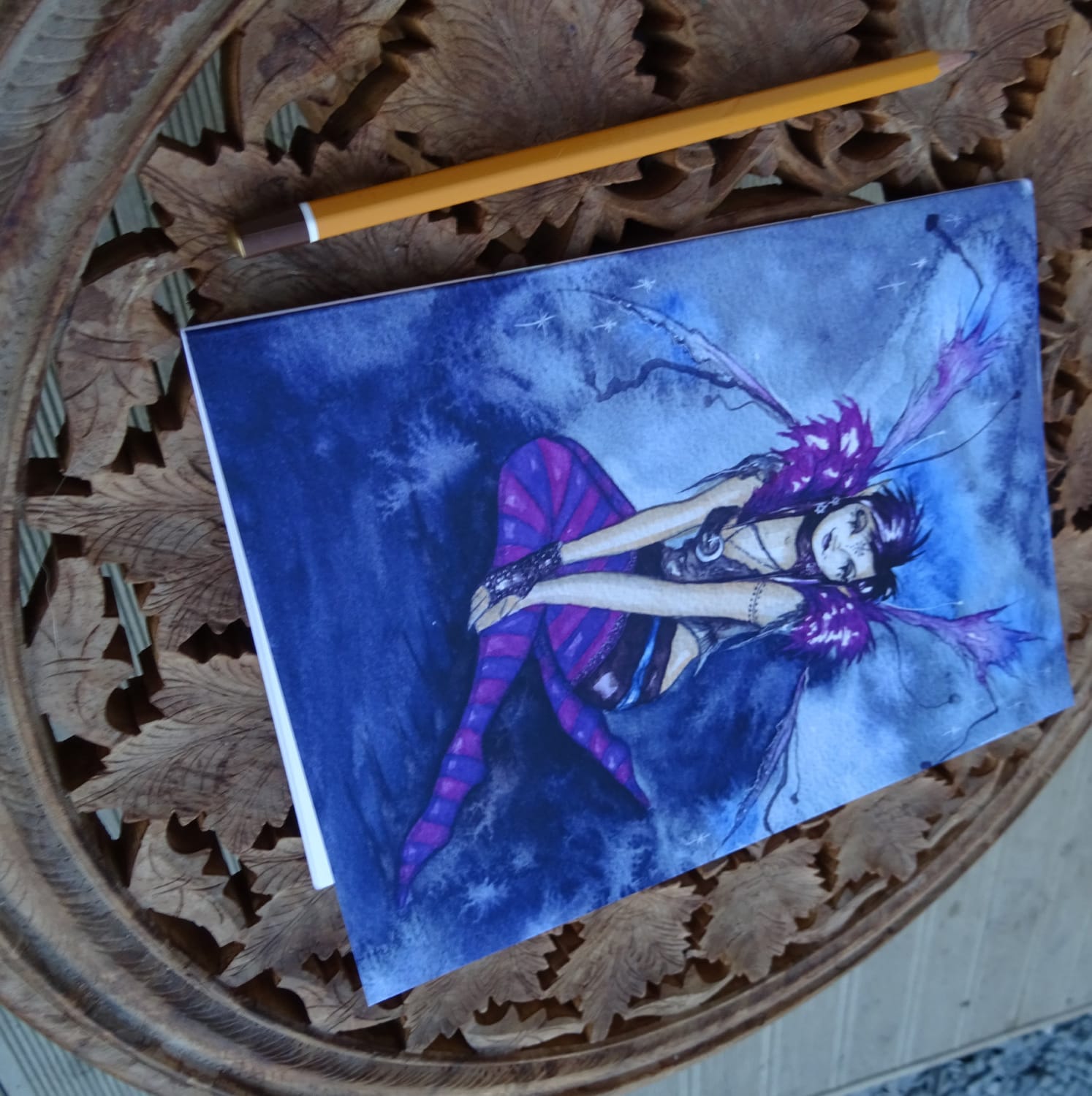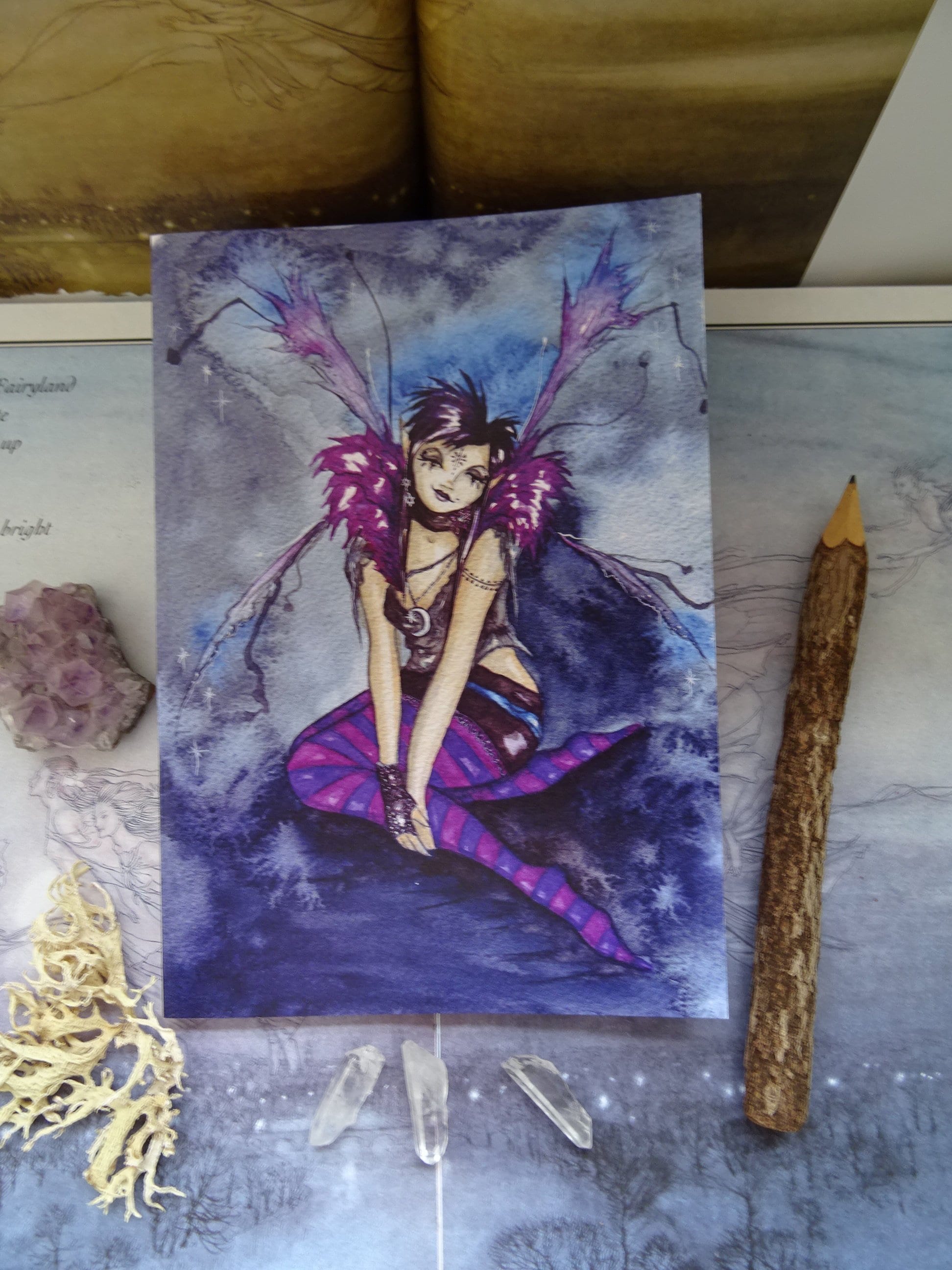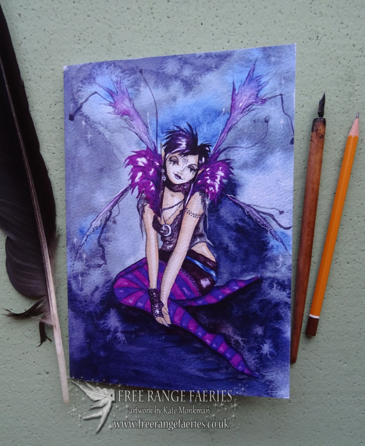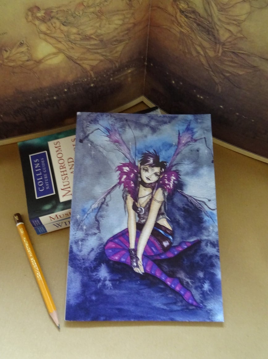 From my original watercolour painting 'Roxy Purpletoes!' painted as a gift for my friend, her wings are slightly disheveled  as she has been out dancing all night!