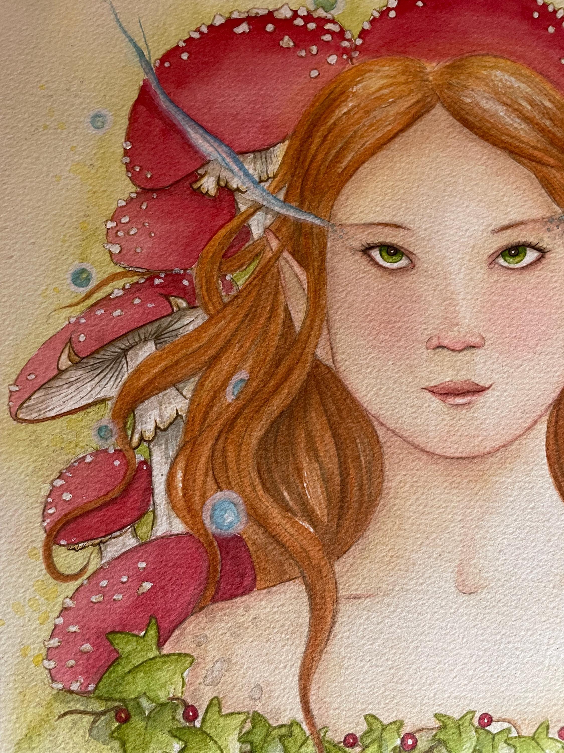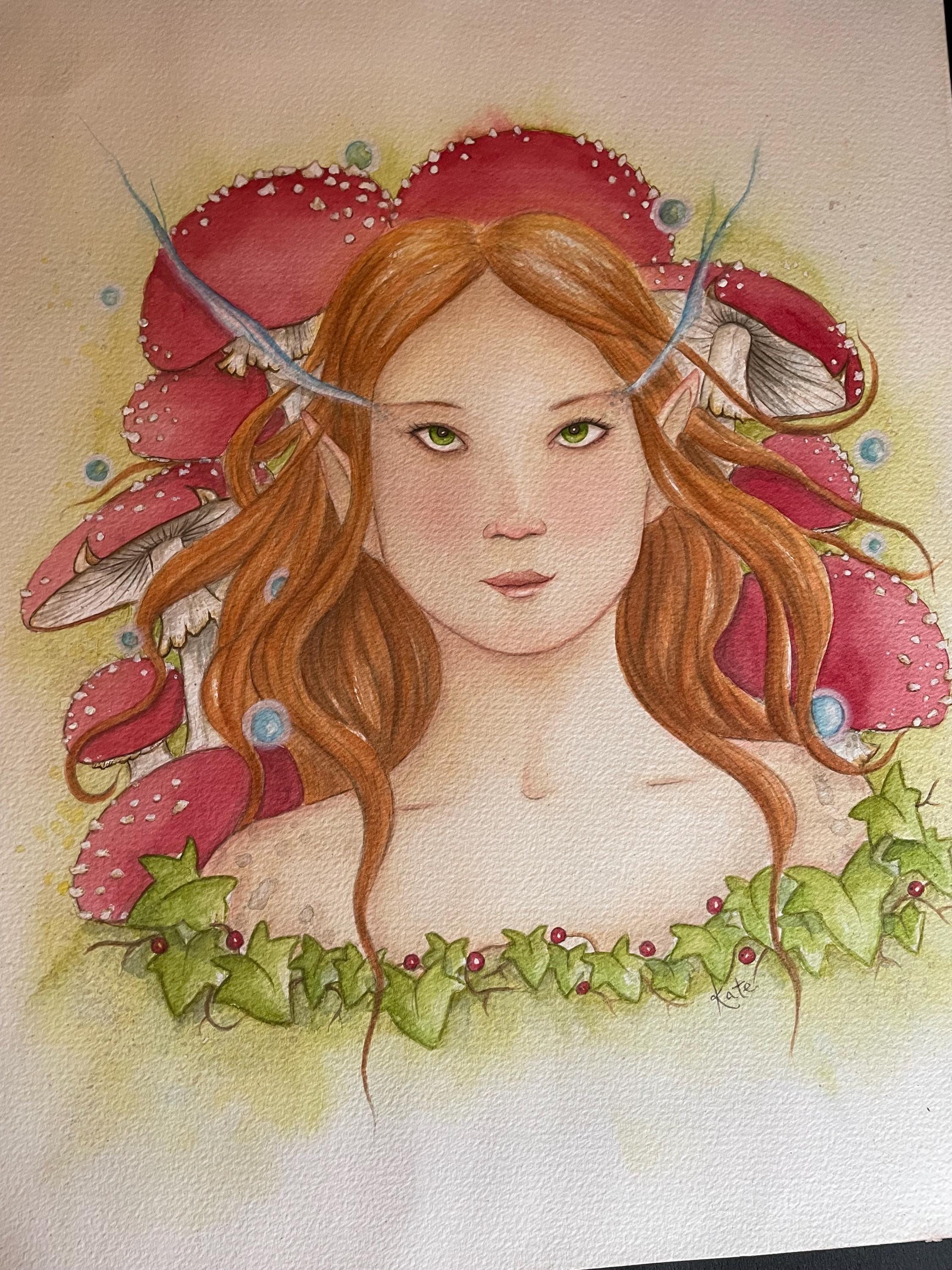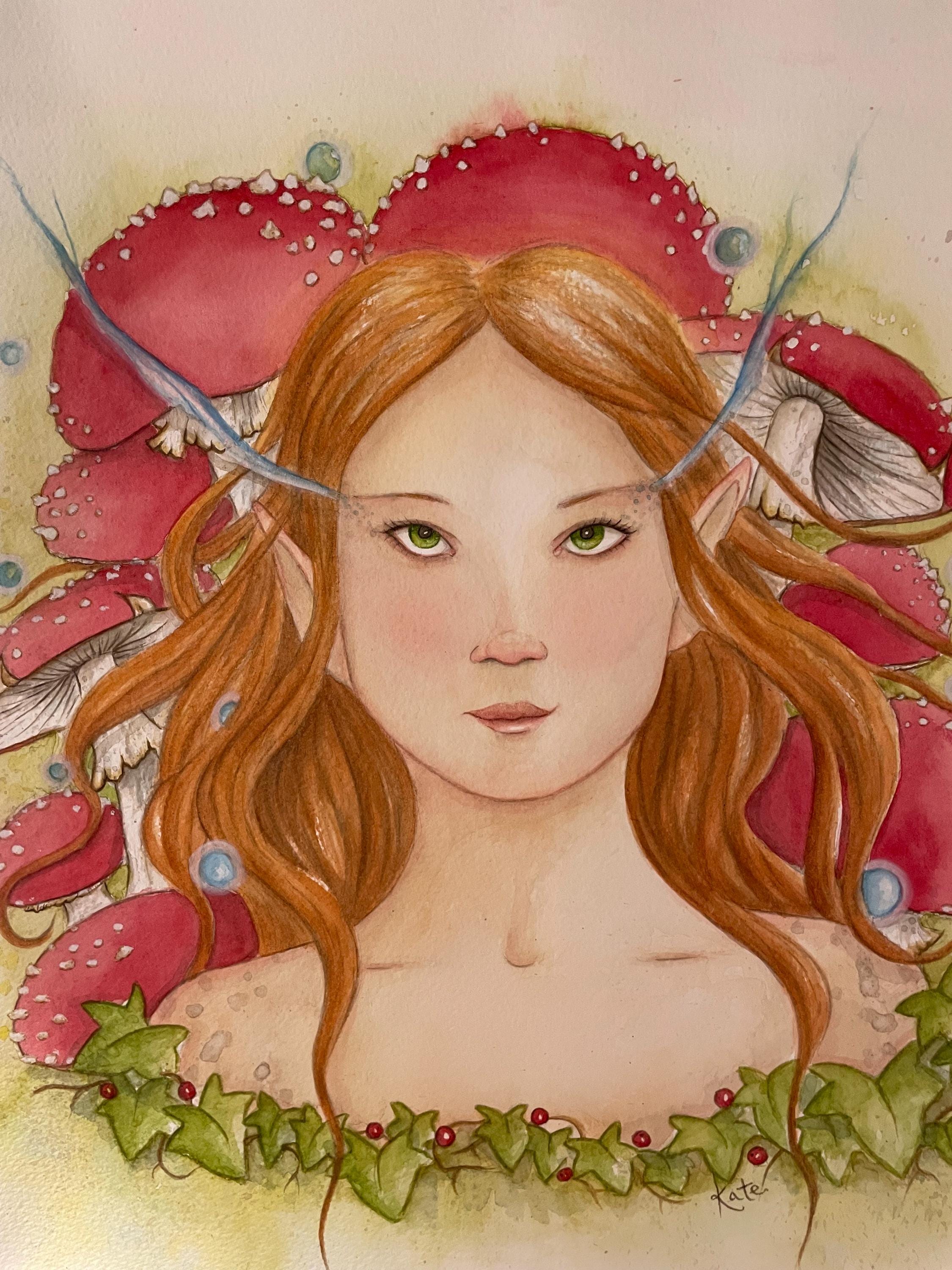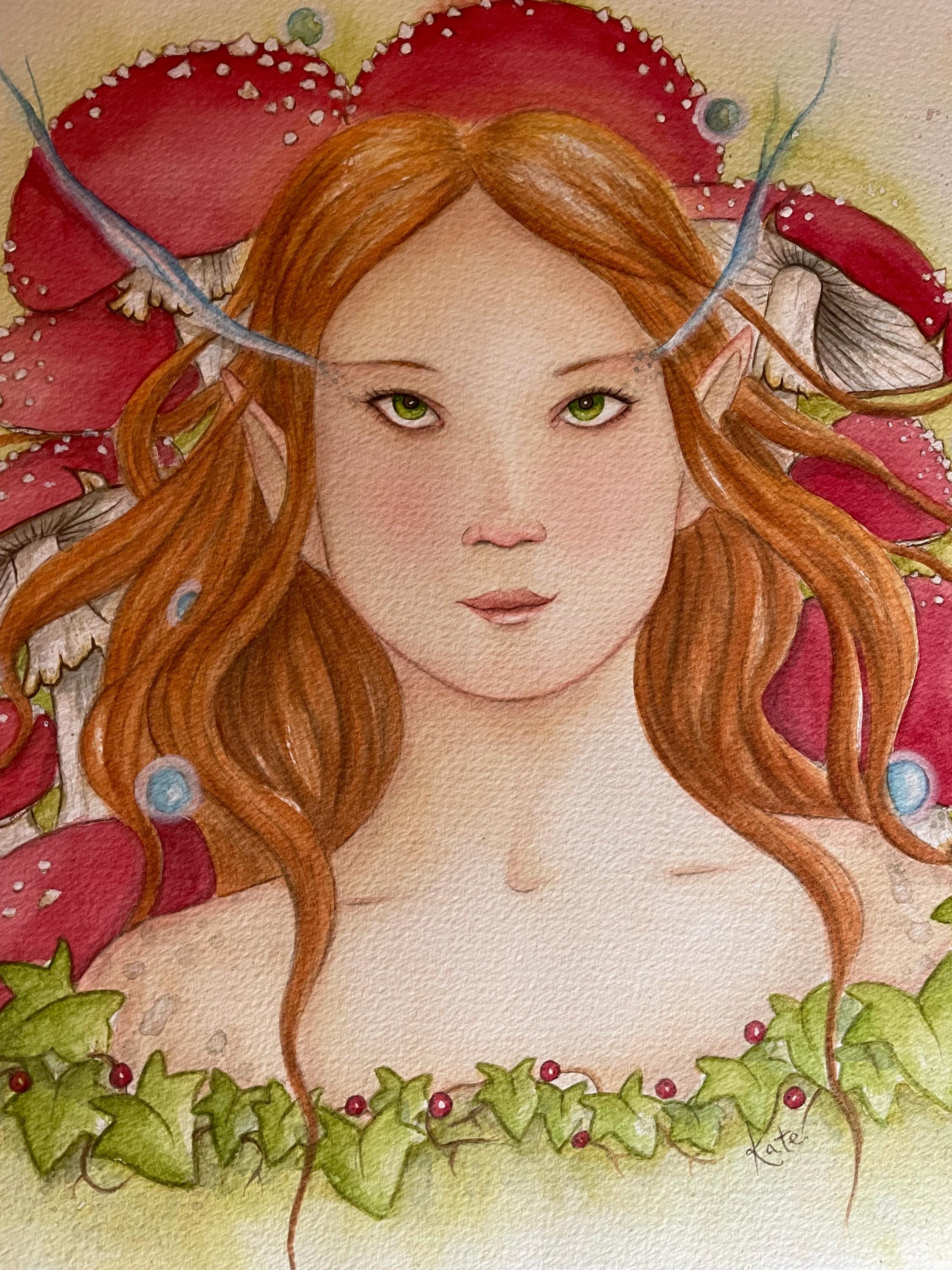 In this painting a magical faerie being appears from a ring of Fly Agaric toadstools, The mushroom/fungus world holds many magical mysteries & I love to try & capture this in paintings