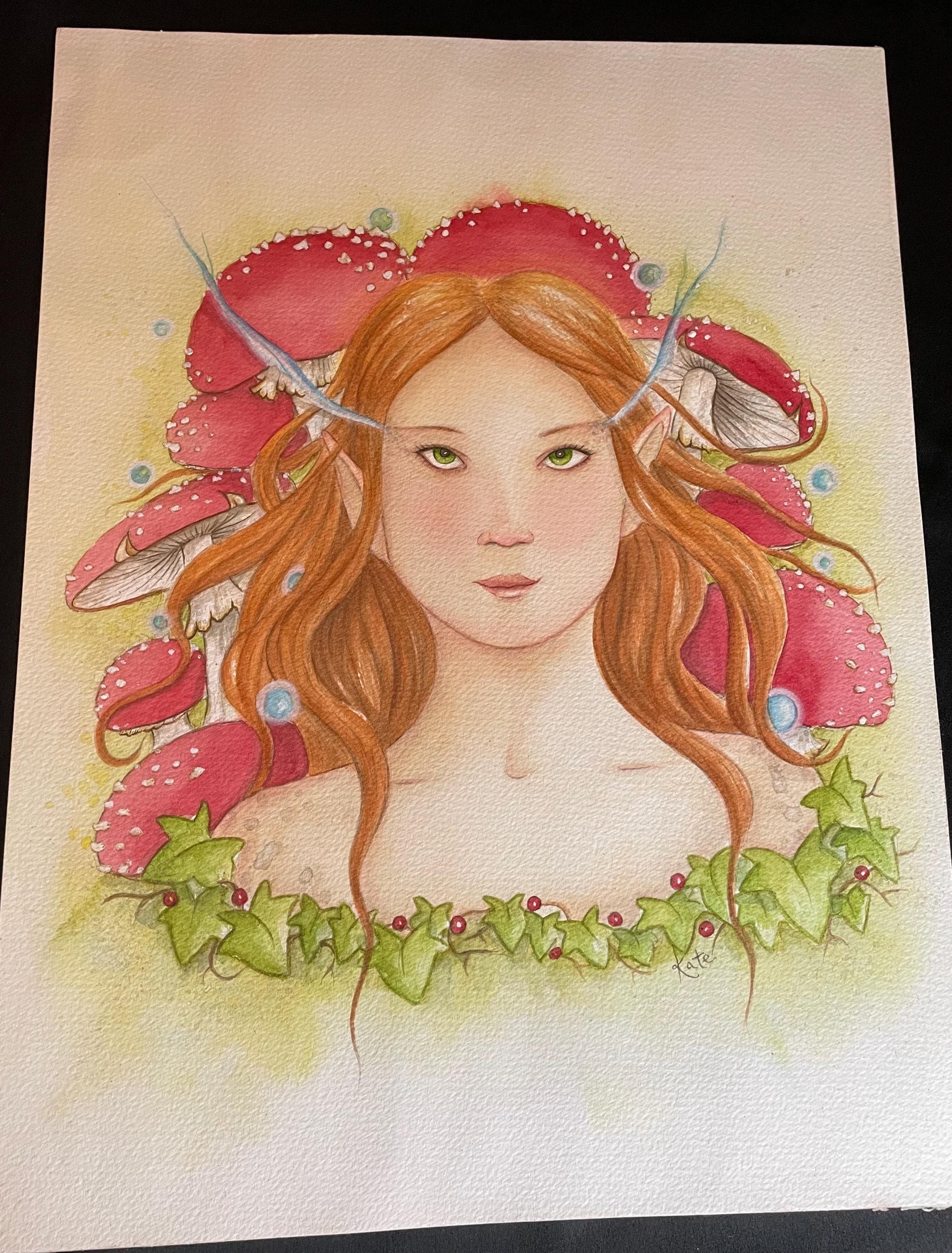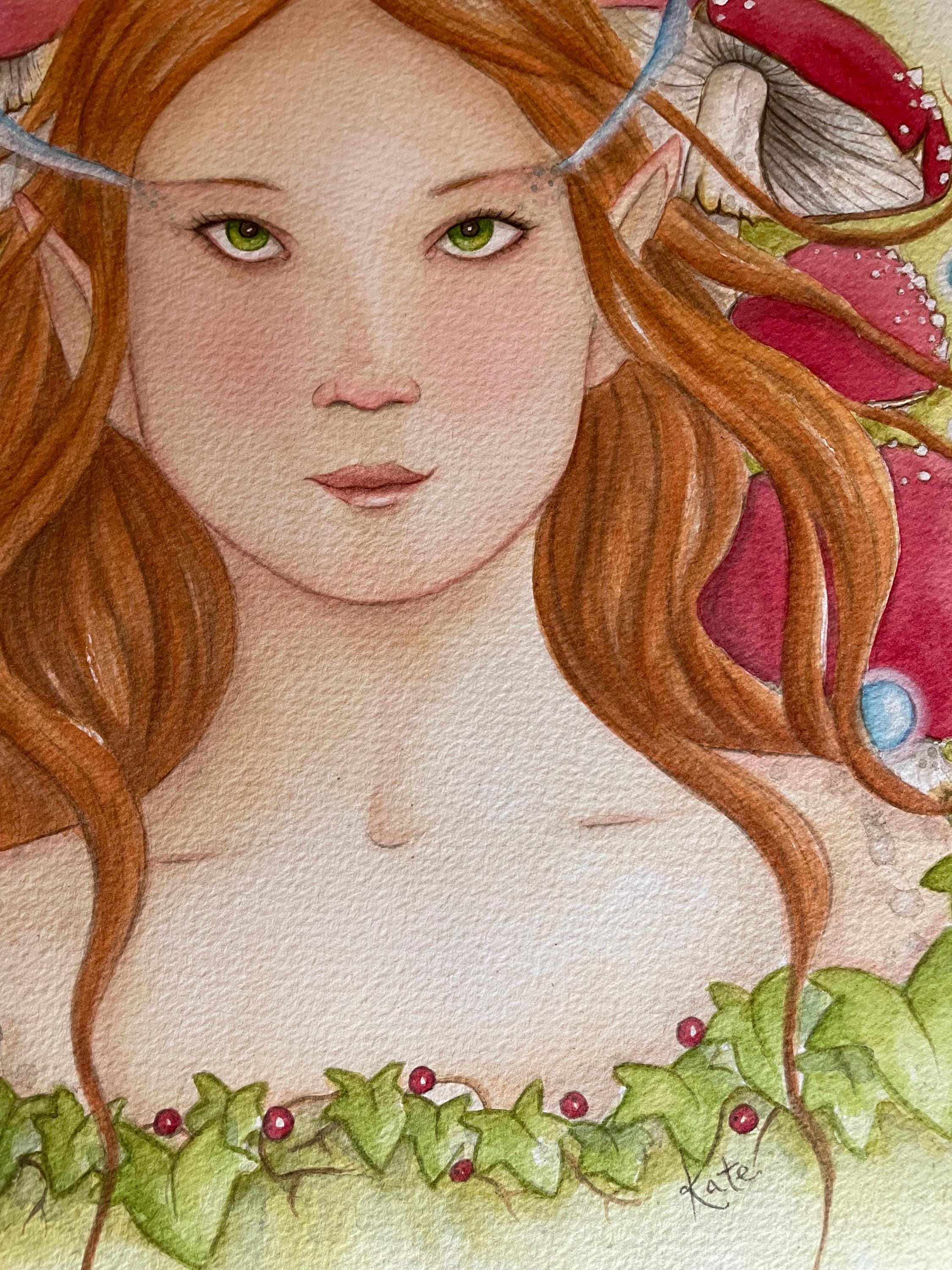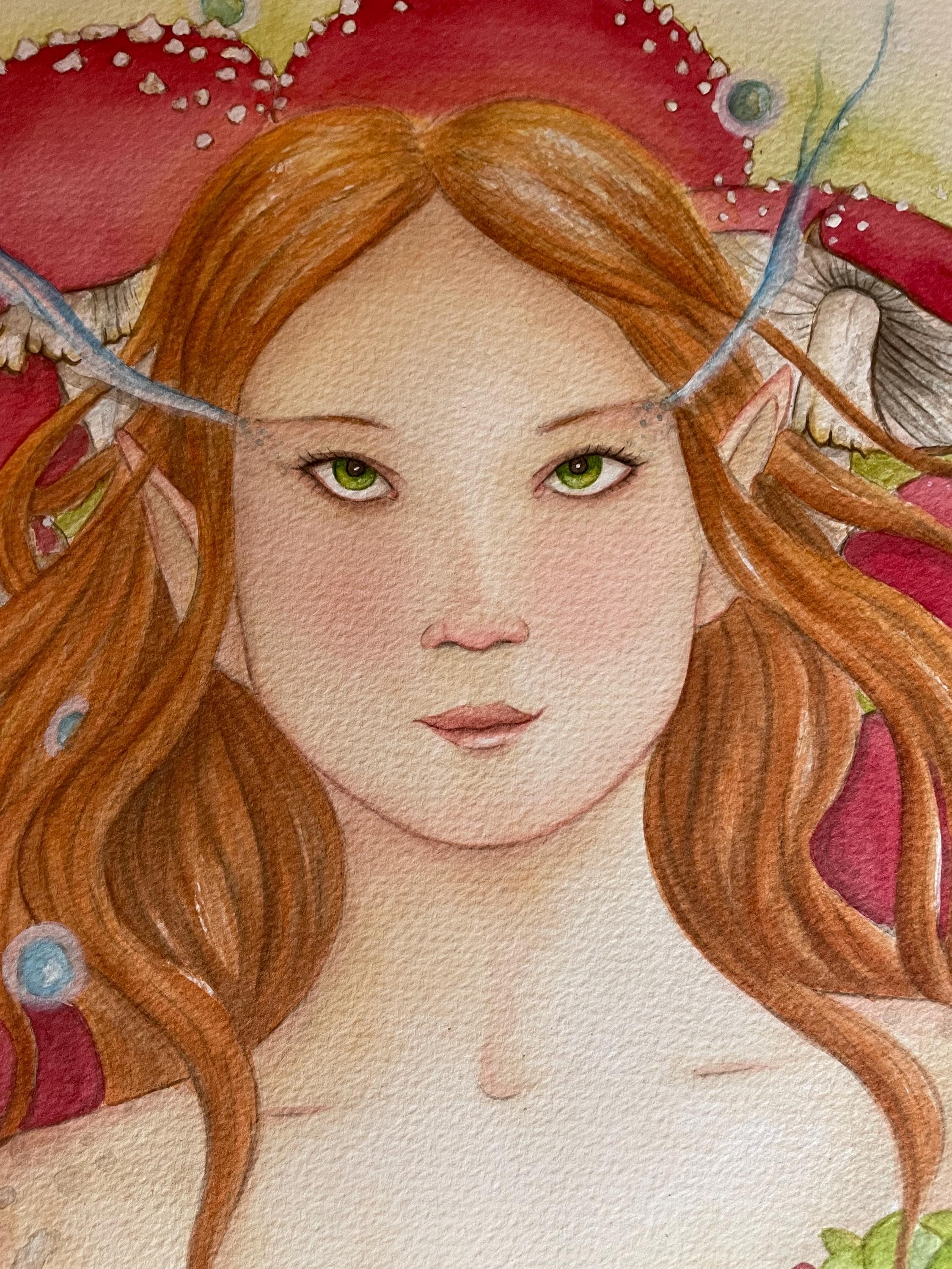 In this painting a magical faerie being appears from a ring of Fly Agaric toadstools, The mushroom/fungus world holds many magical mysteries & I love to try & capture this in paintings