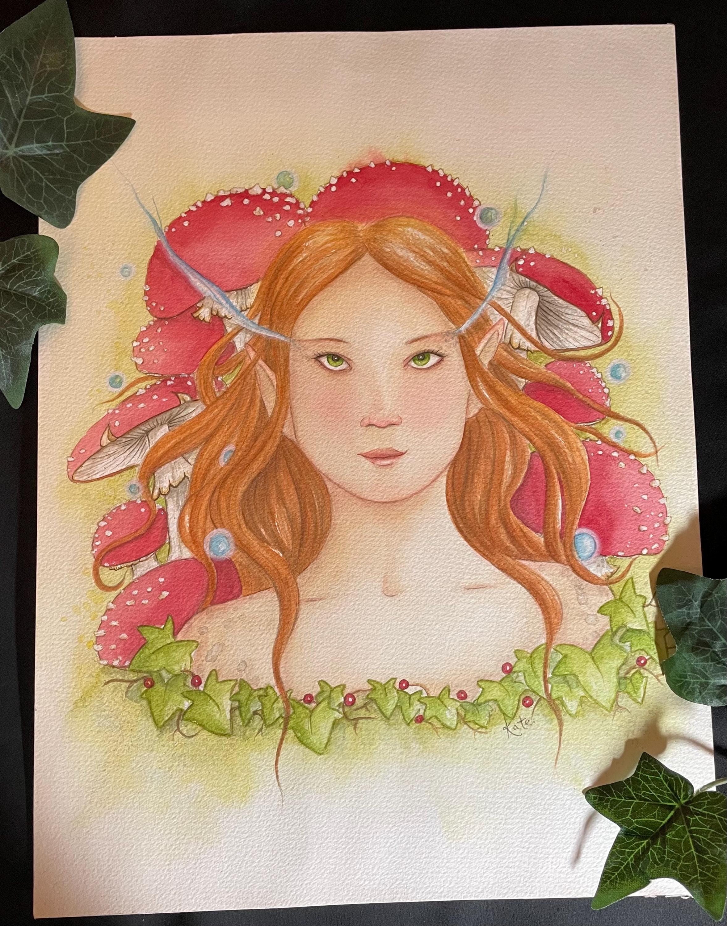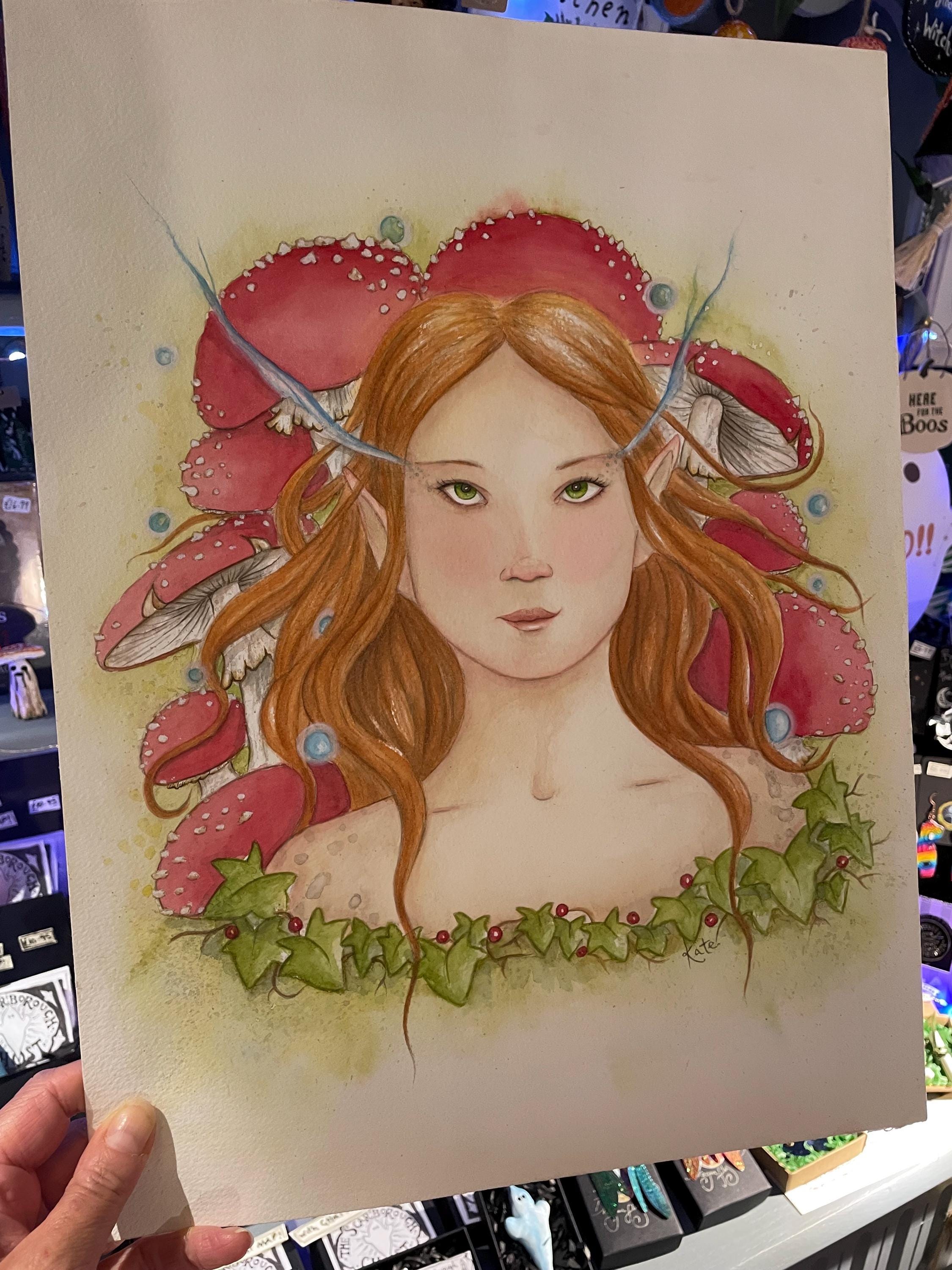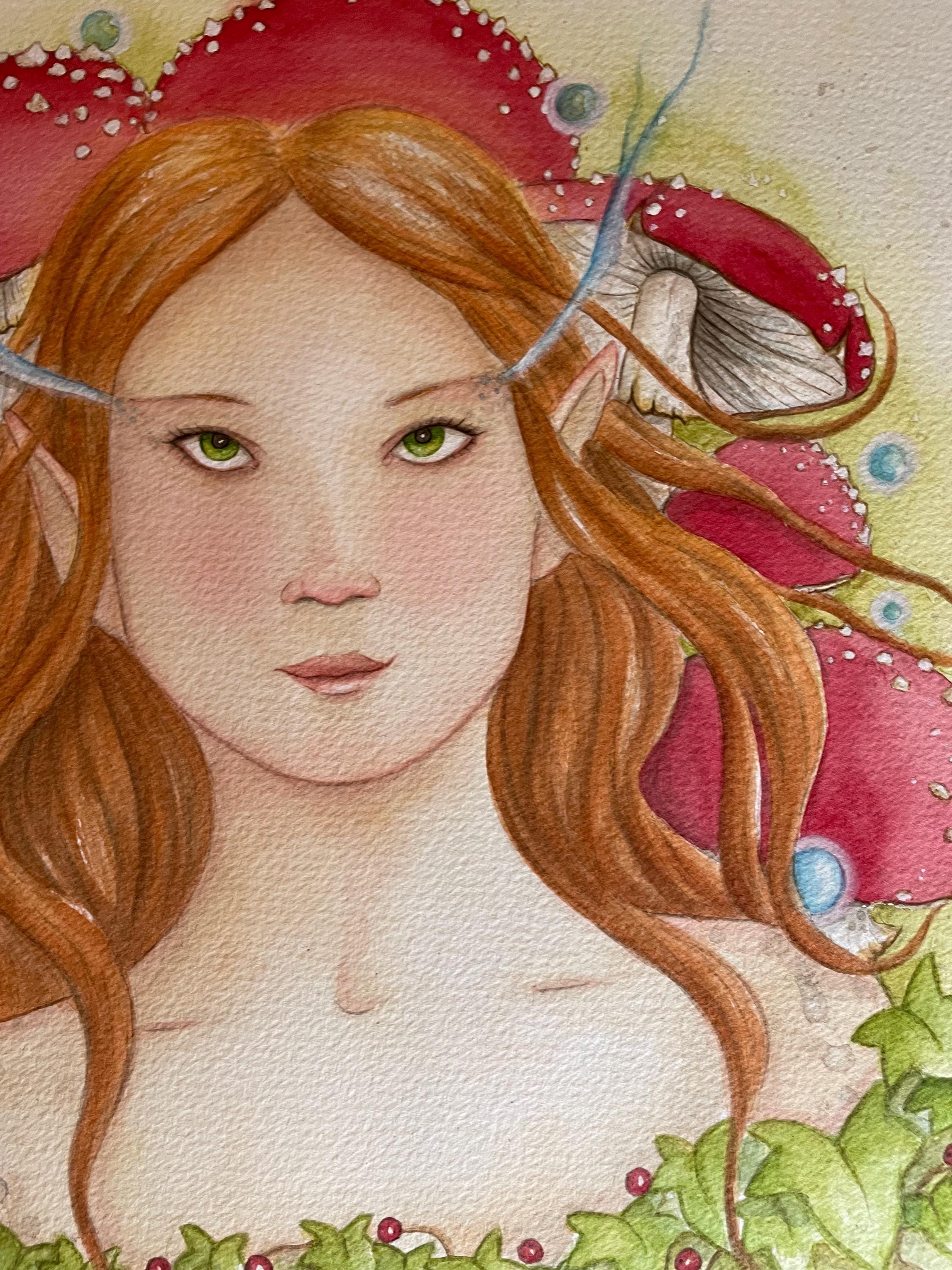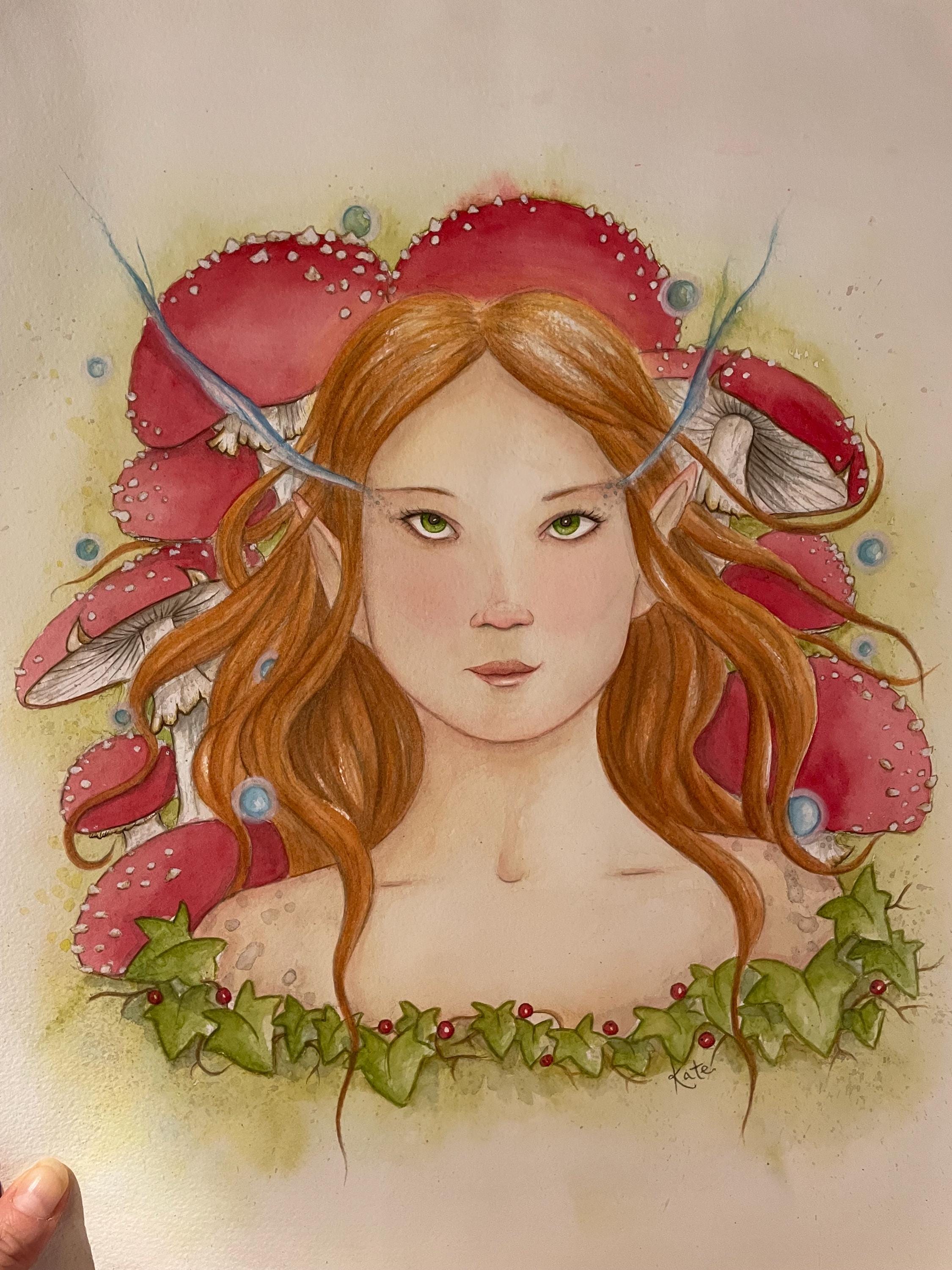 In this painting a magical faerie being appears from a ring of Fly Agaric toadstools, The mushroom/fungus world holds many magical mysteries & I love to try & capture this in paintings