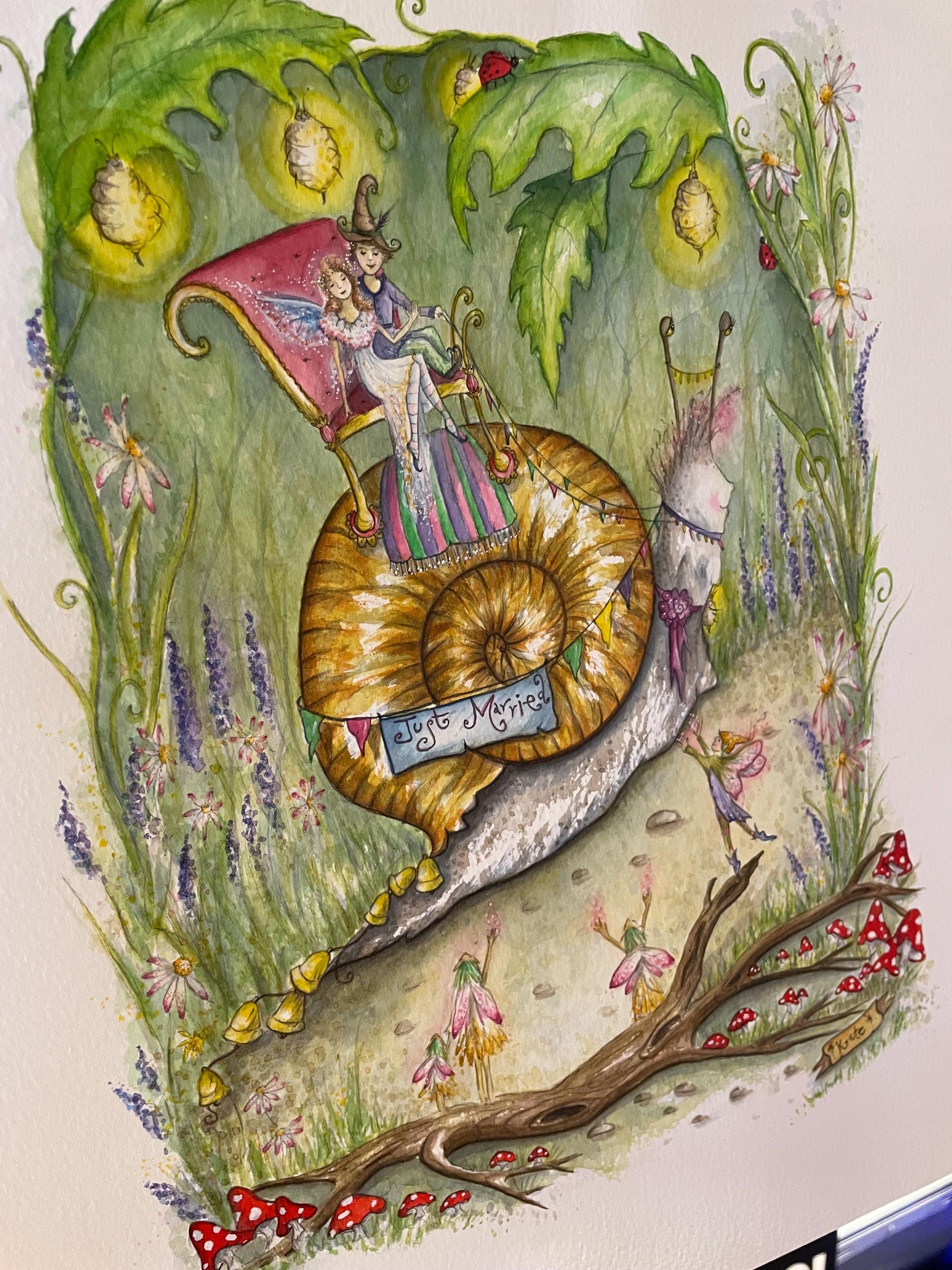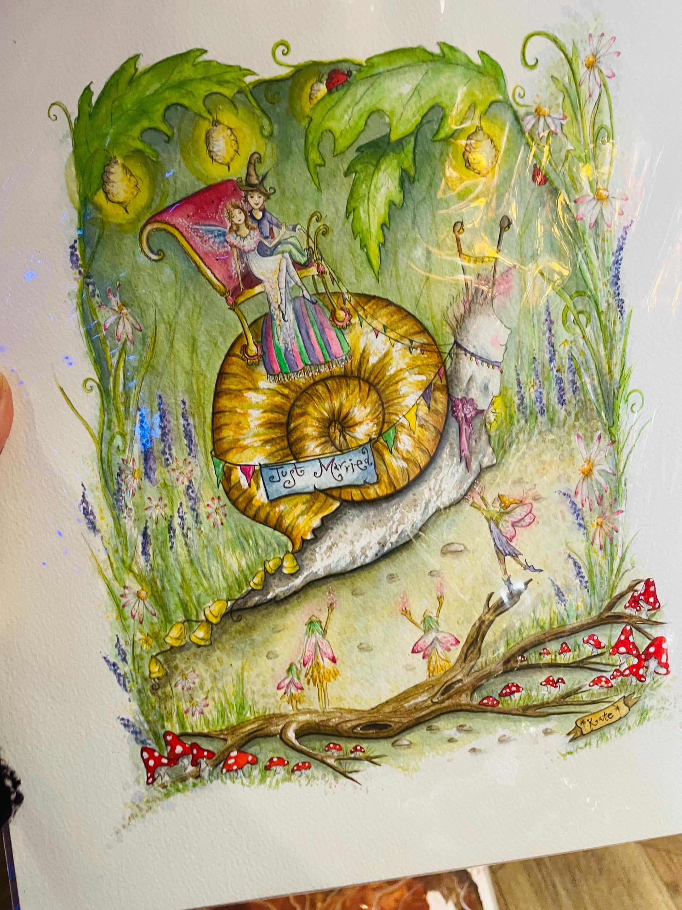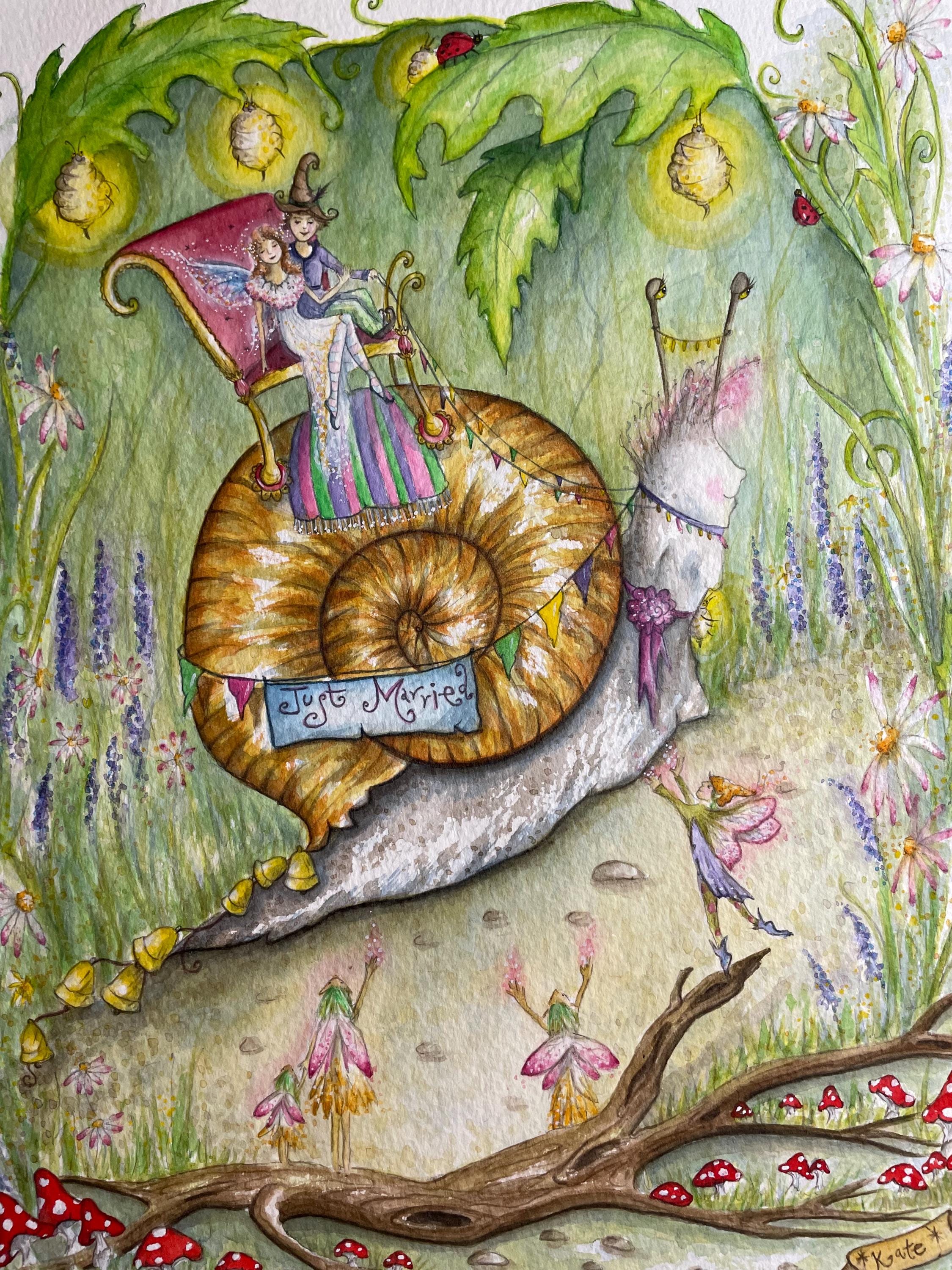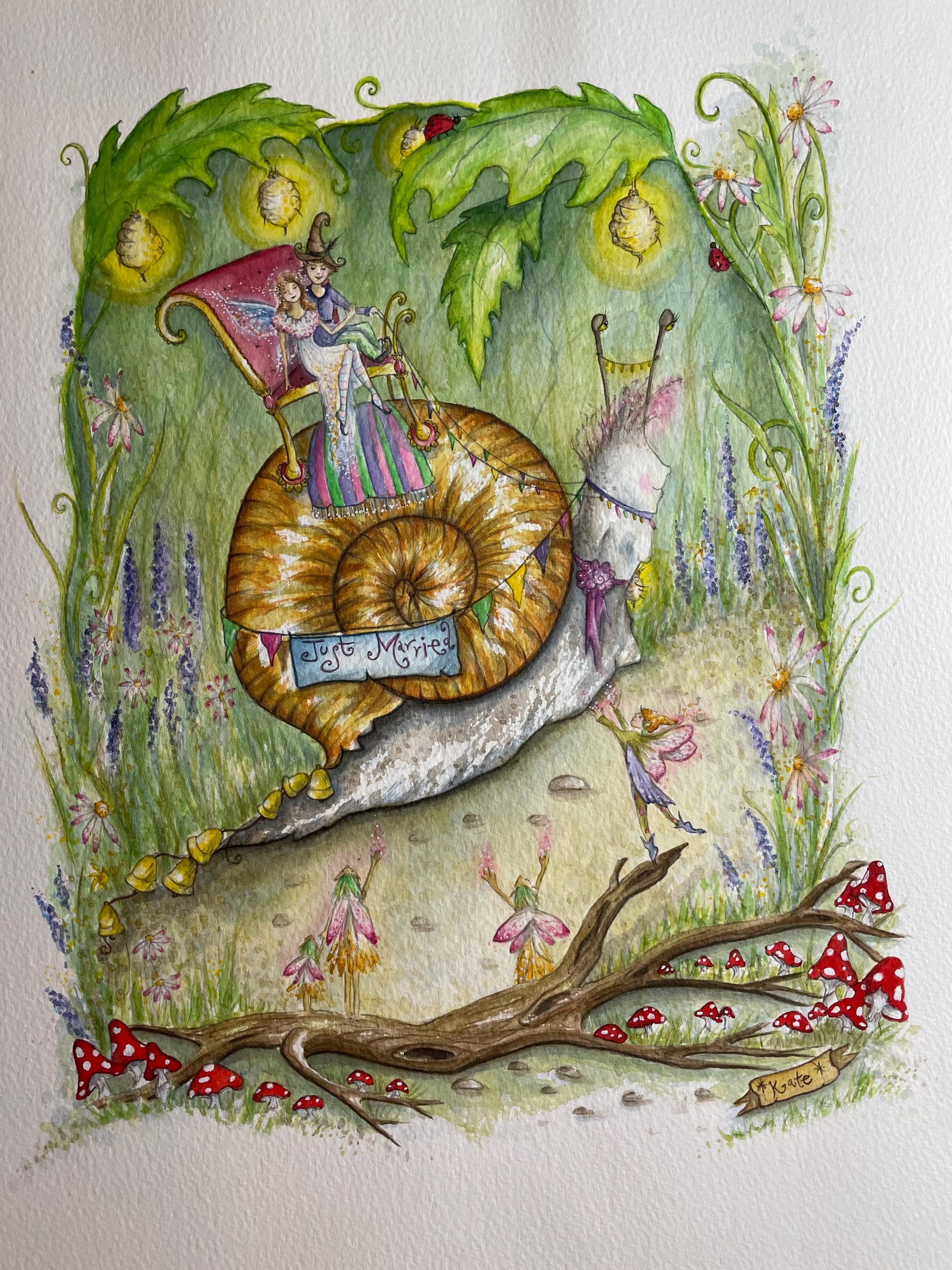 A fun illustration that I painted as I wanted an artwork would be suitable for making wedding cards, I had lots of fun painting all the little creatures & fairies celebrating the wedding procession