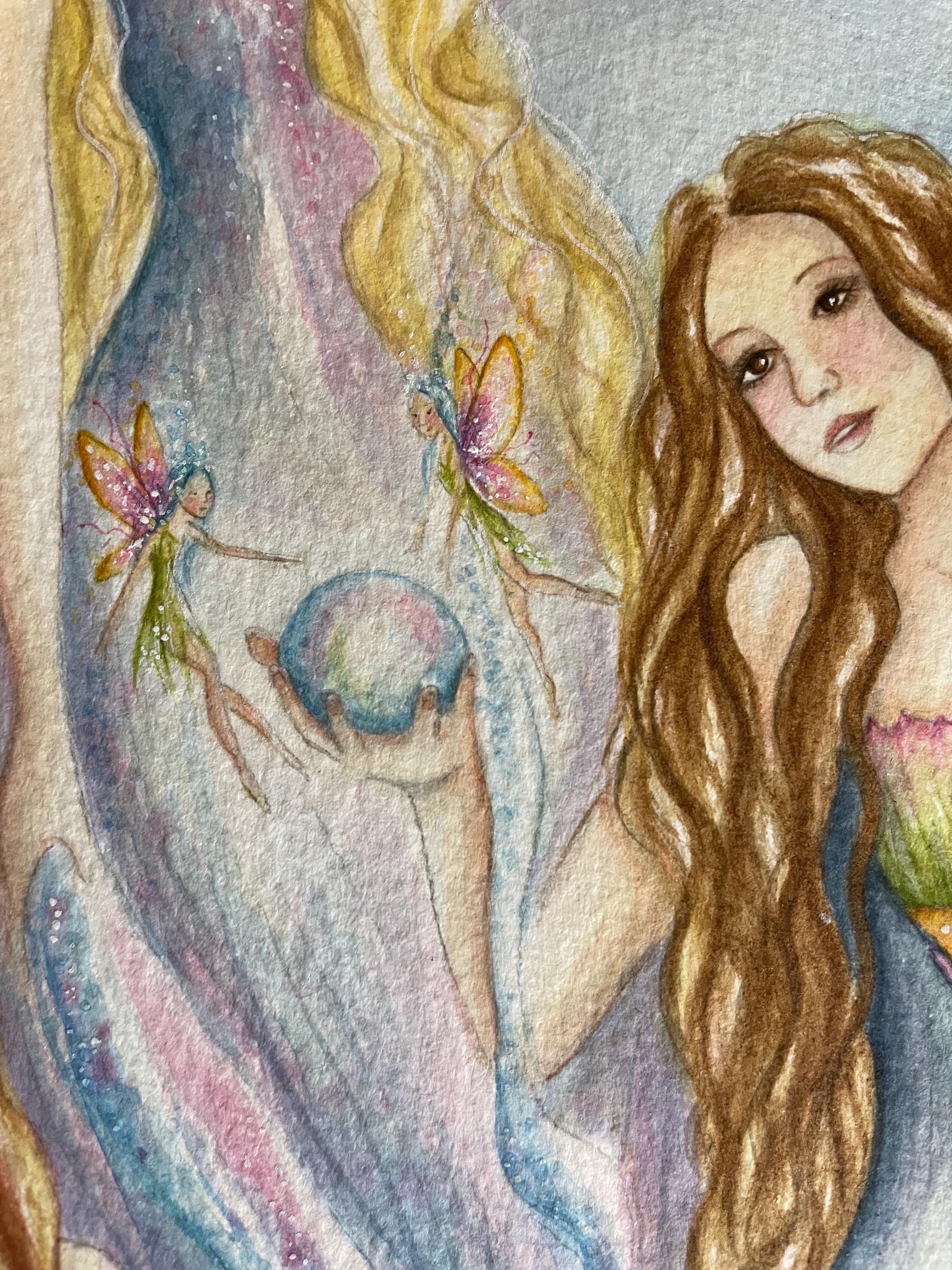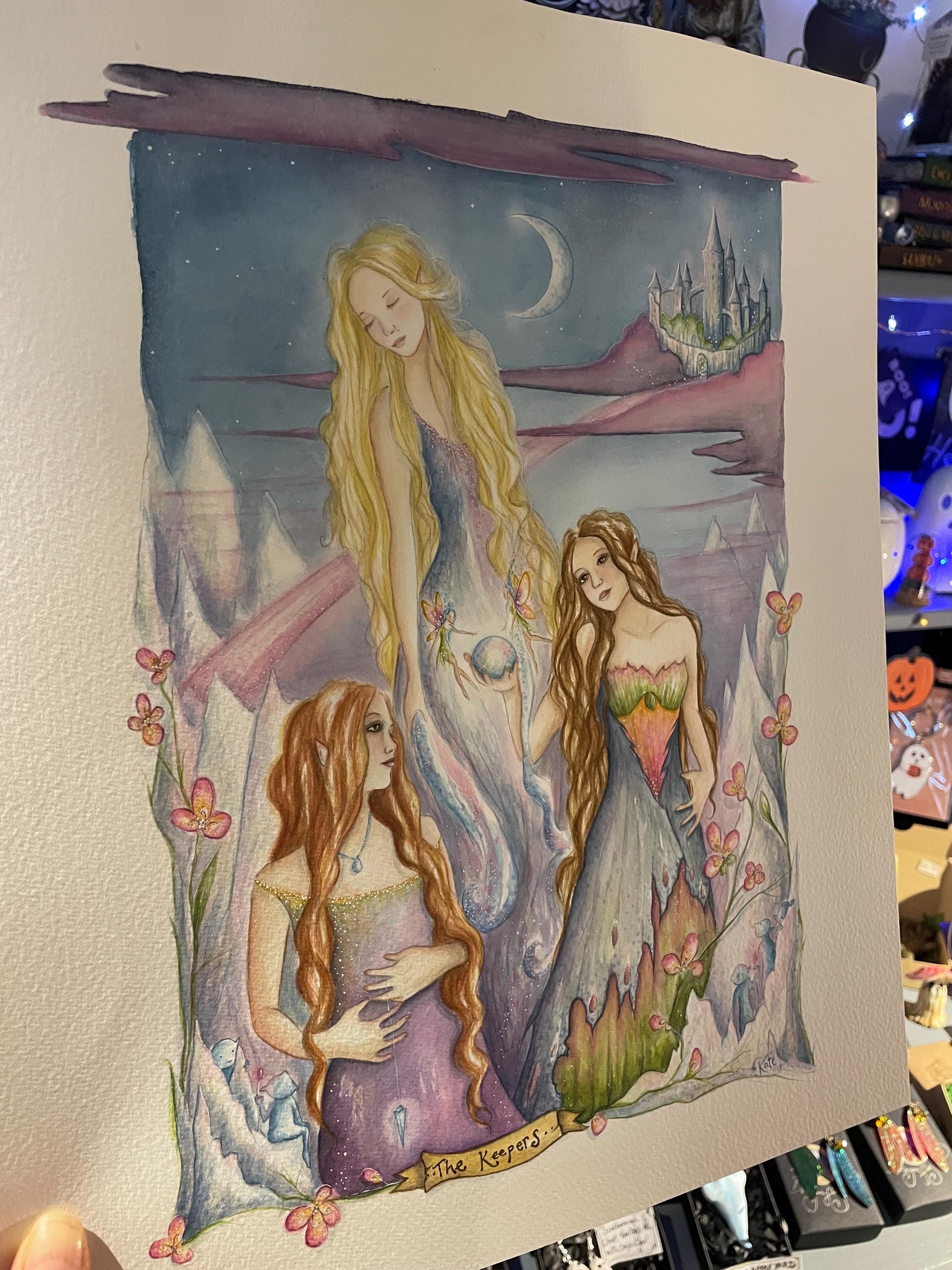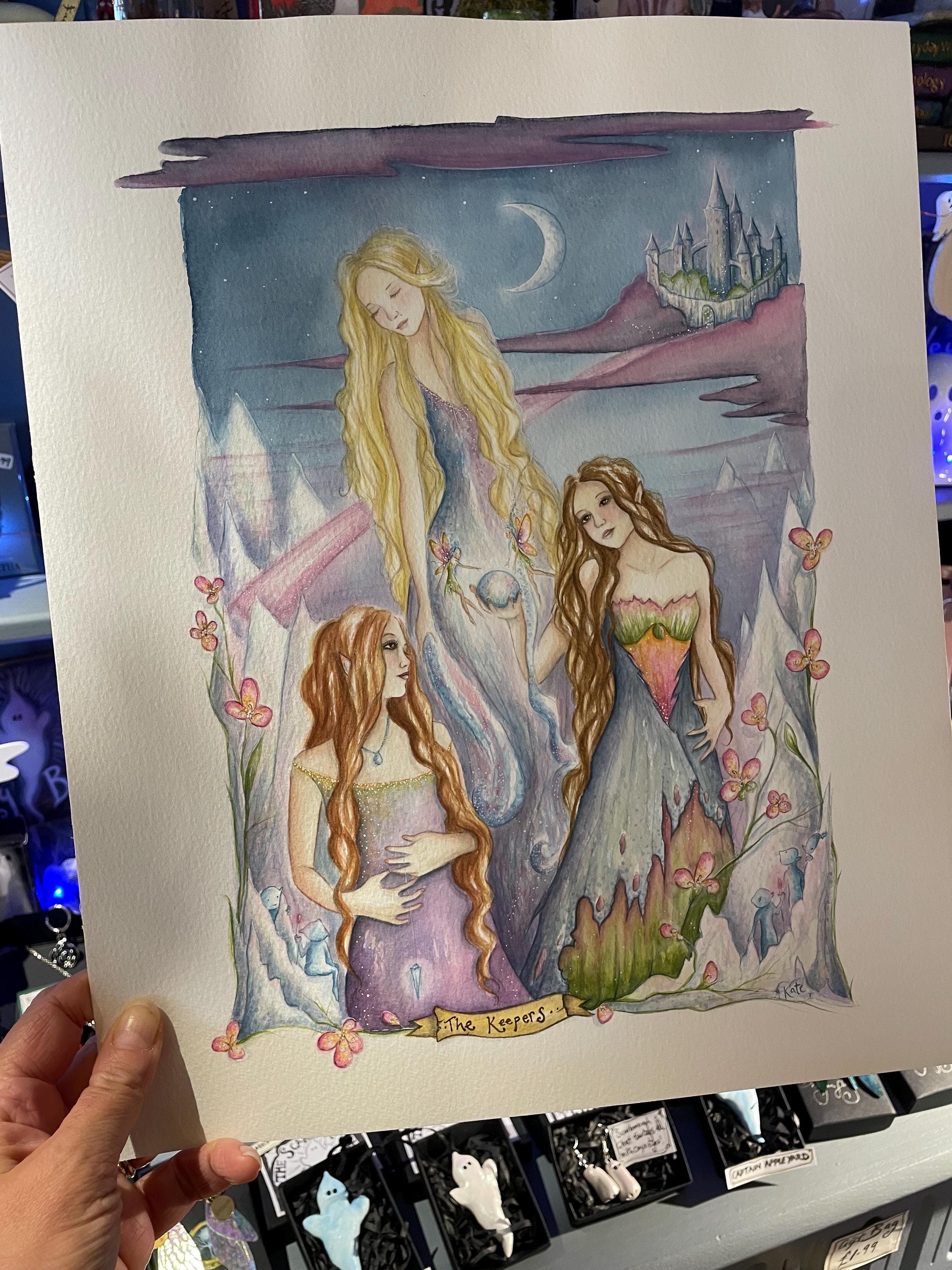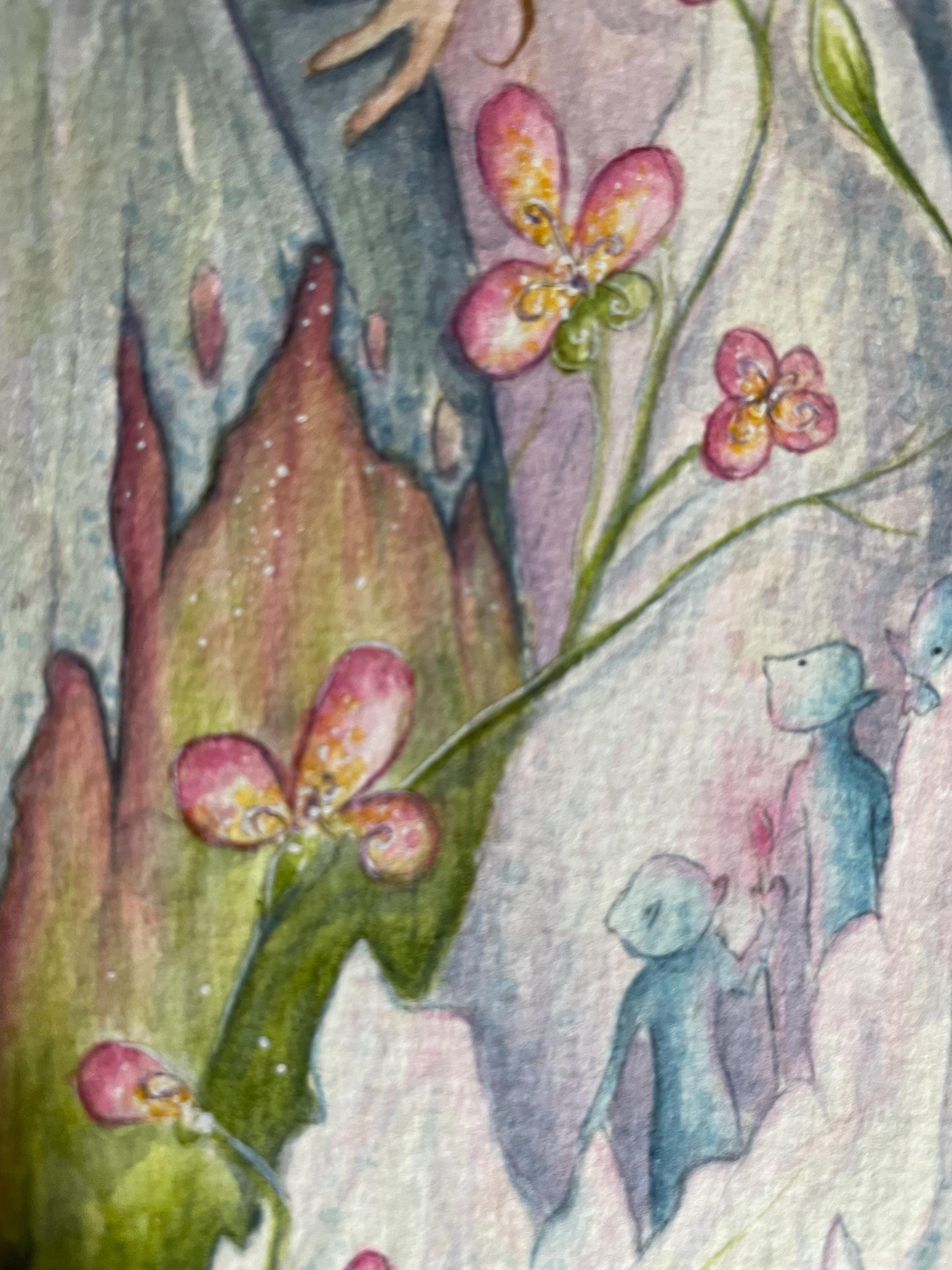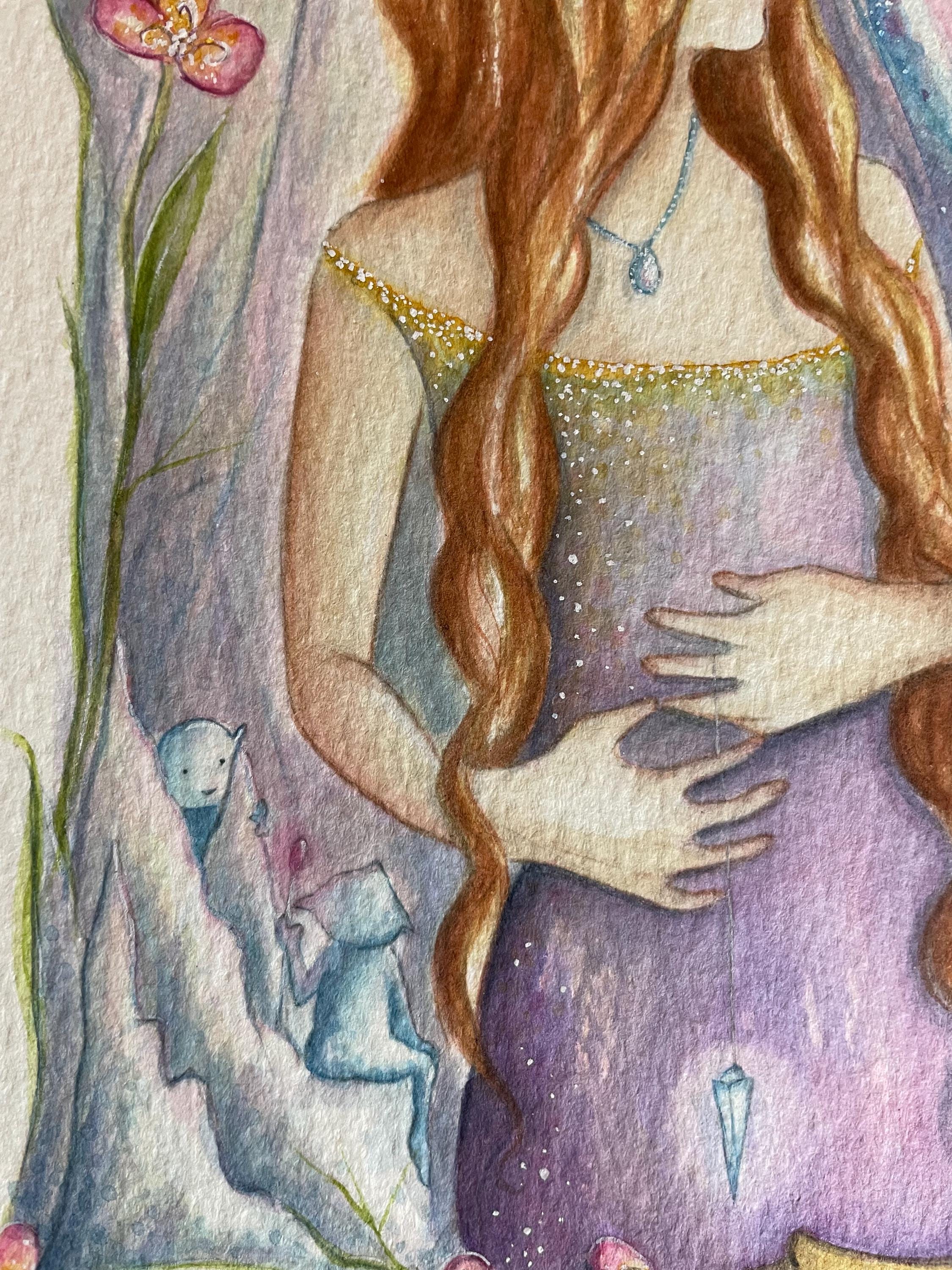 Painted using watercolours gouache on 140lb, 300g/m2 cold pressed watercolour paper, in a protective plastic sleeve