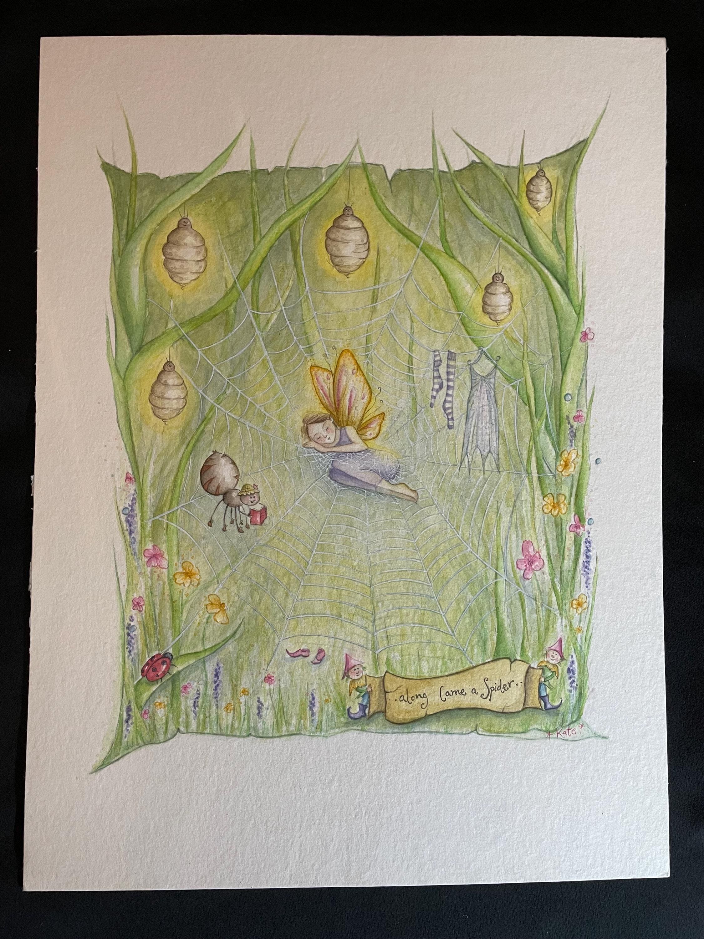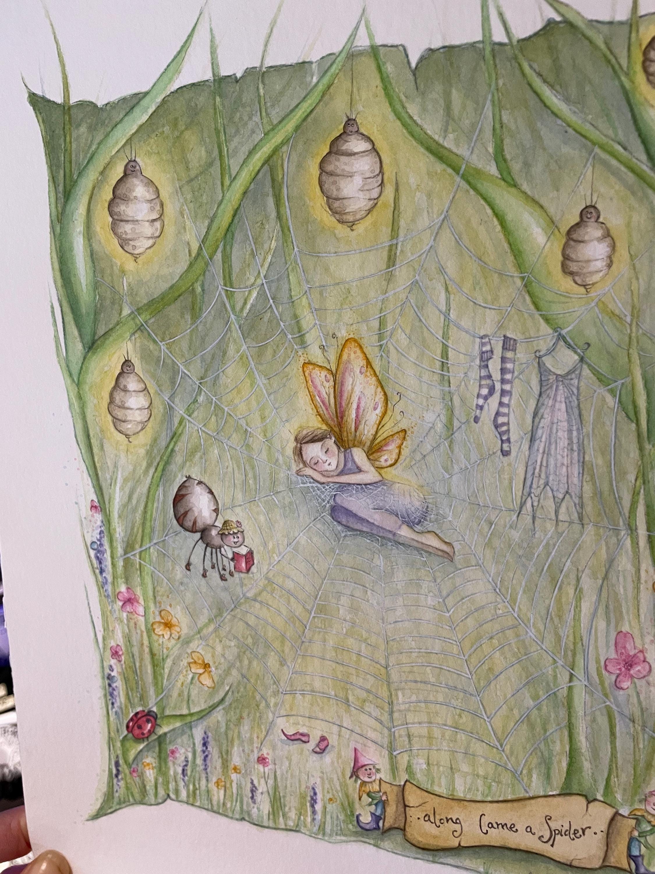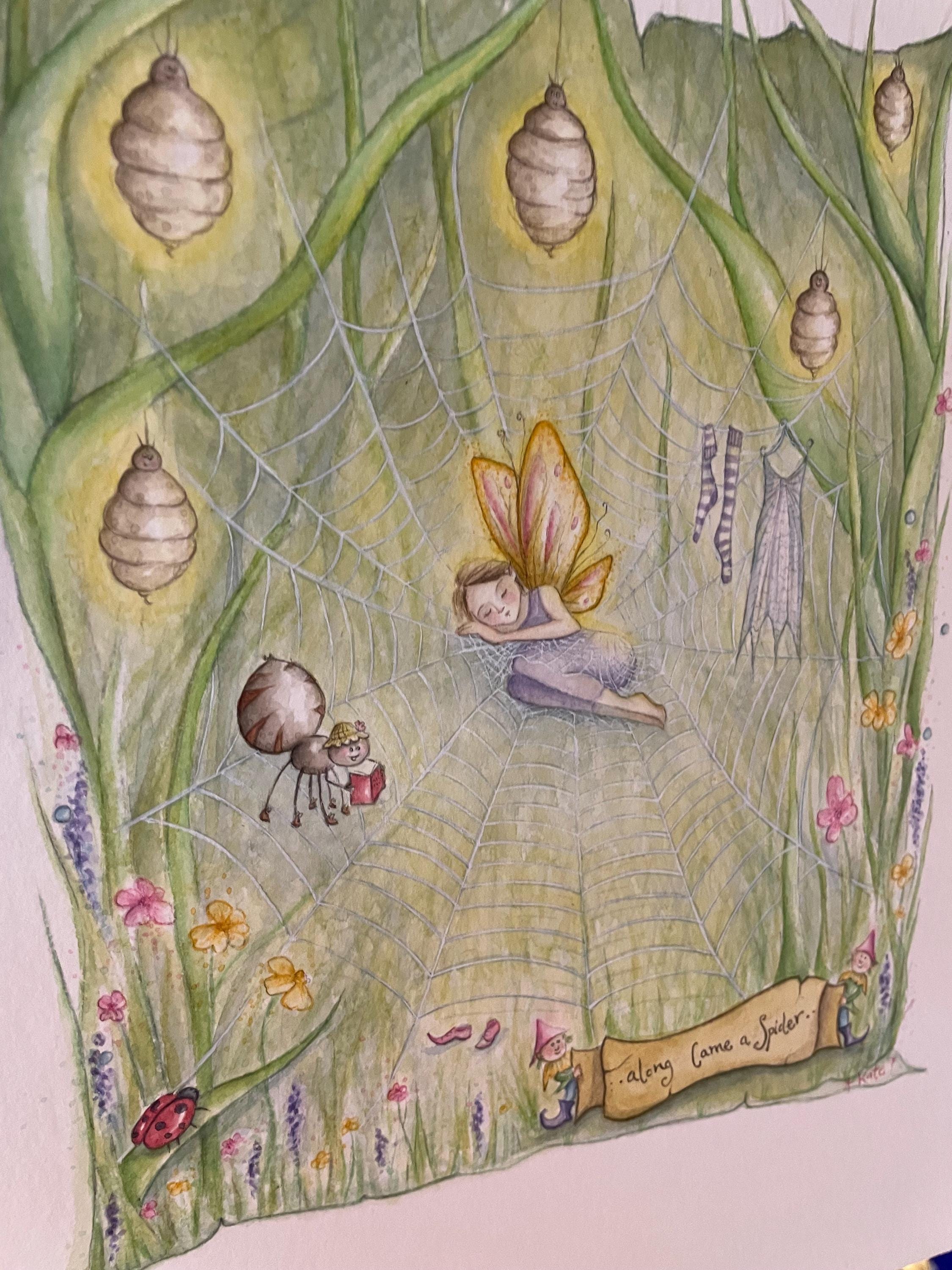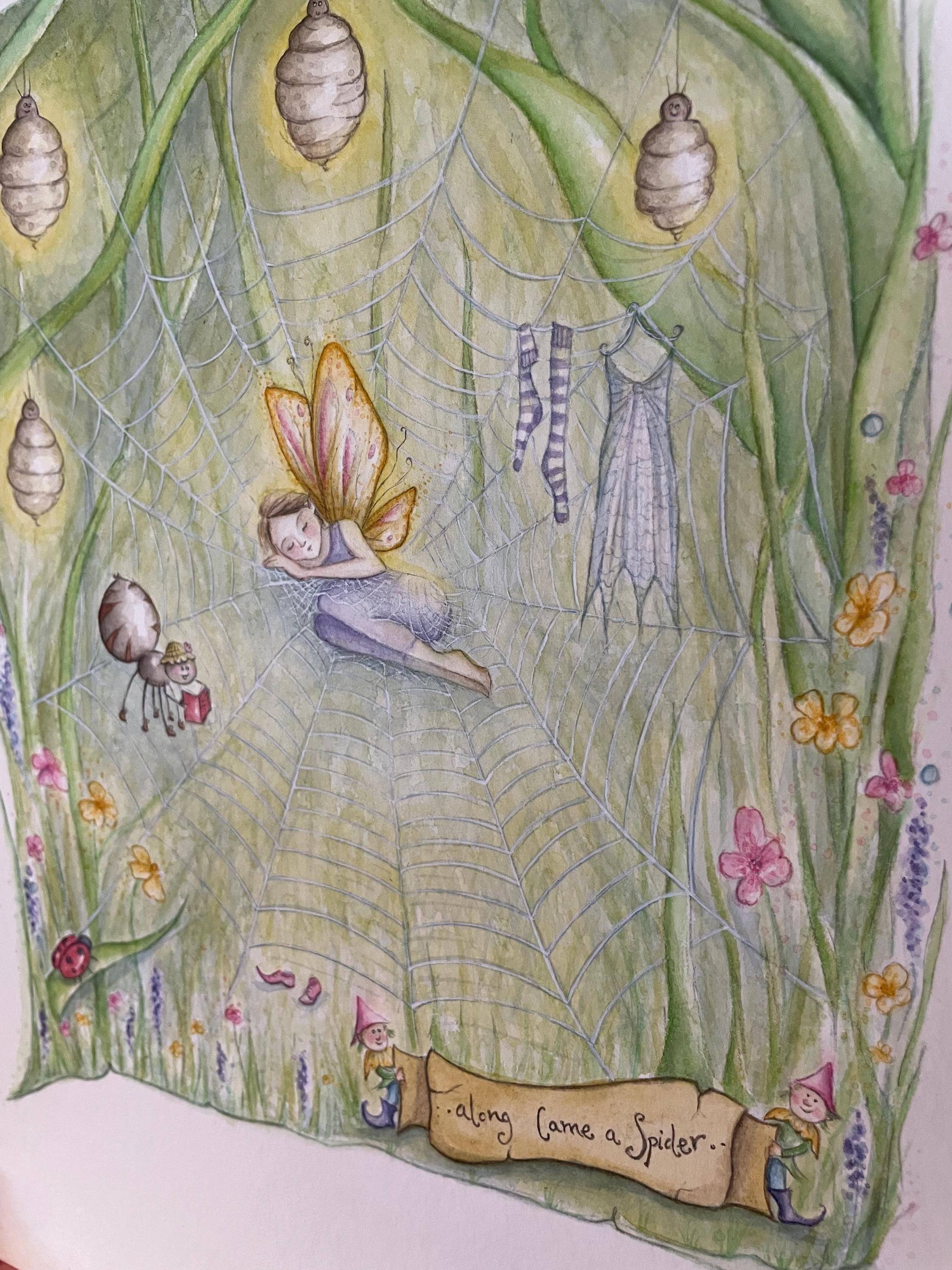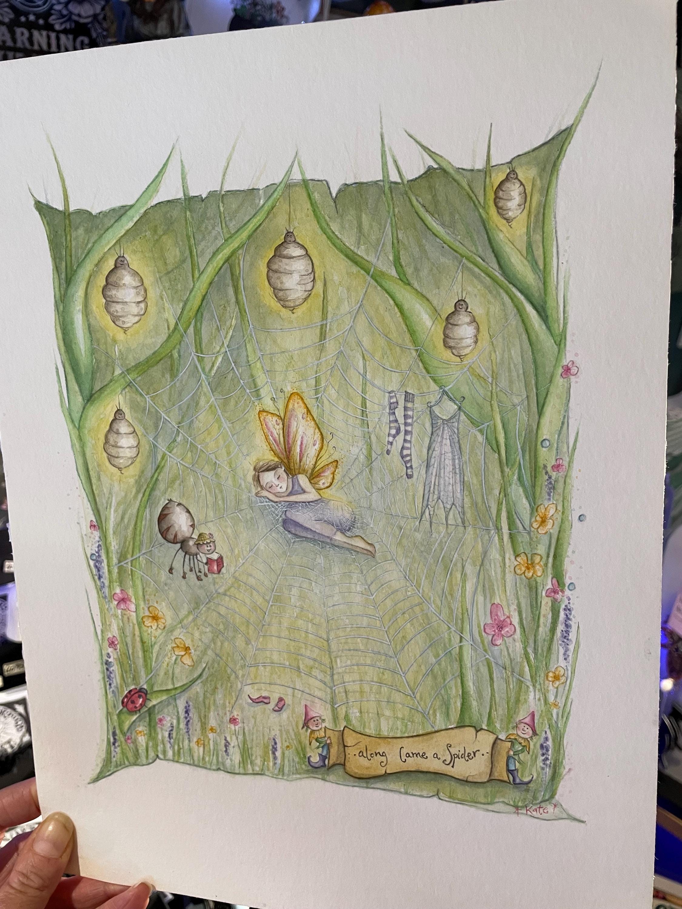 Along came a spider was painted as part of the Enchanted Visions art group monthly themes, every month a new title was set & you had the month to finish & submit the work. My first thoughts for the 'Along came a Spider' theme was to do a Gothic dark image but after some further thought I decided to turn the theme on it's head & used the idea of the 'Along came a spider nursery rhyme' & had the image of the Spider being a gentle caring soul & reading the nursery rhyme to a sleeping fairy