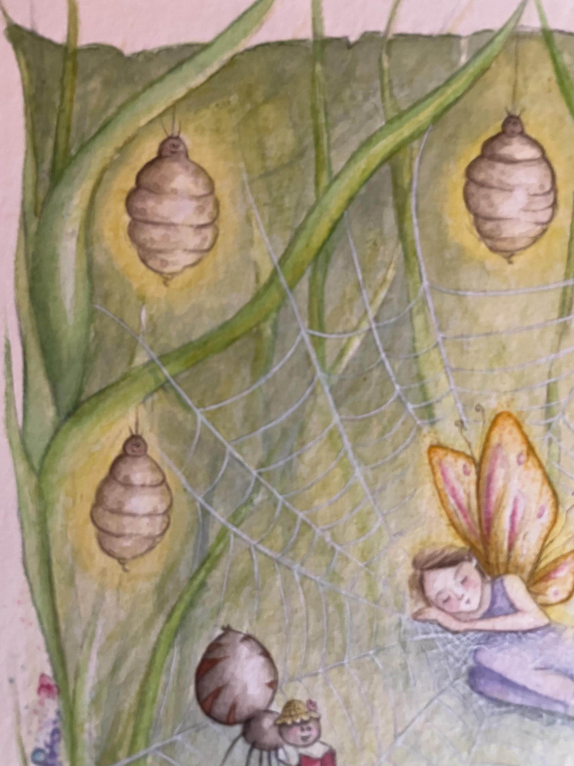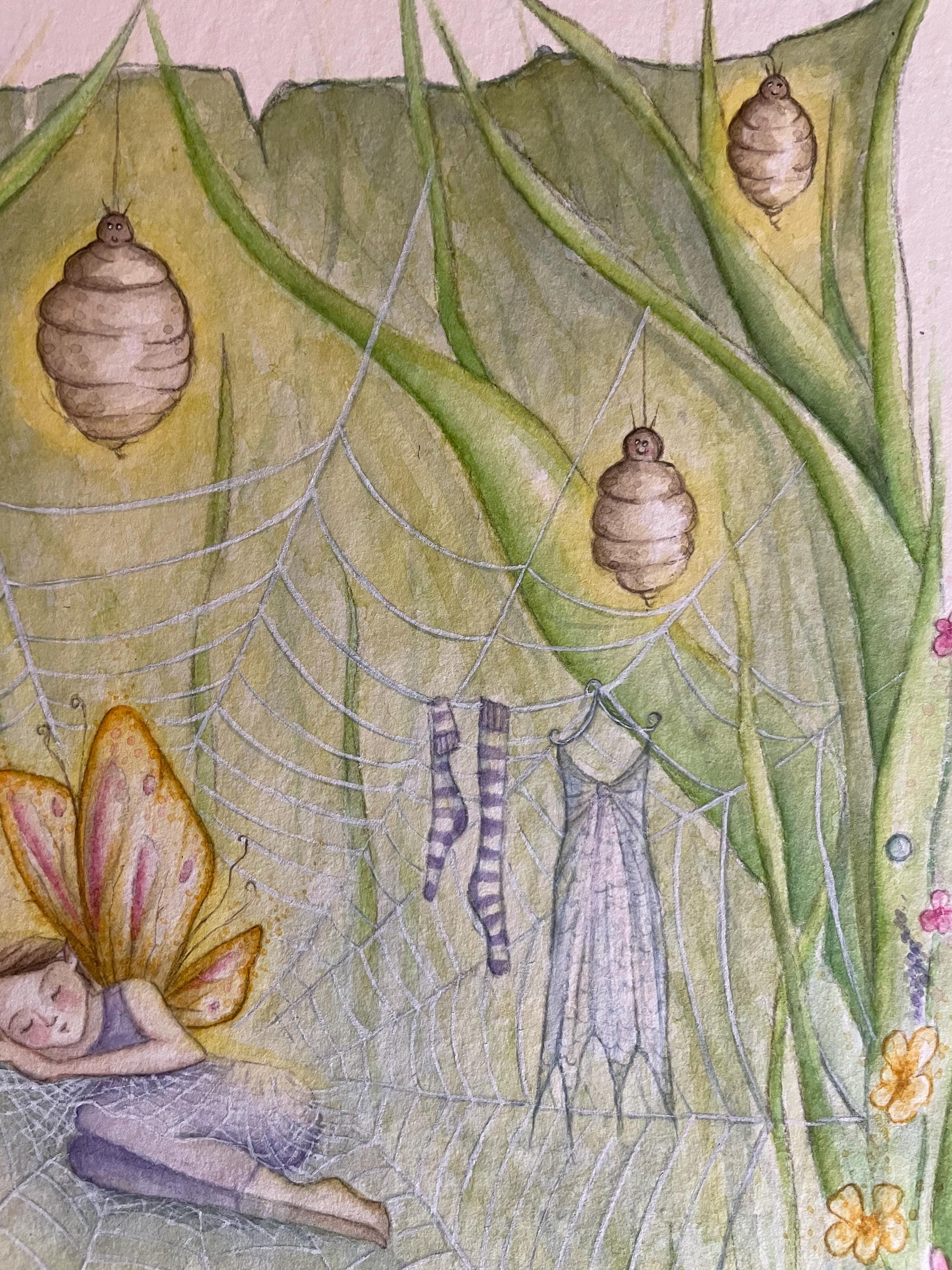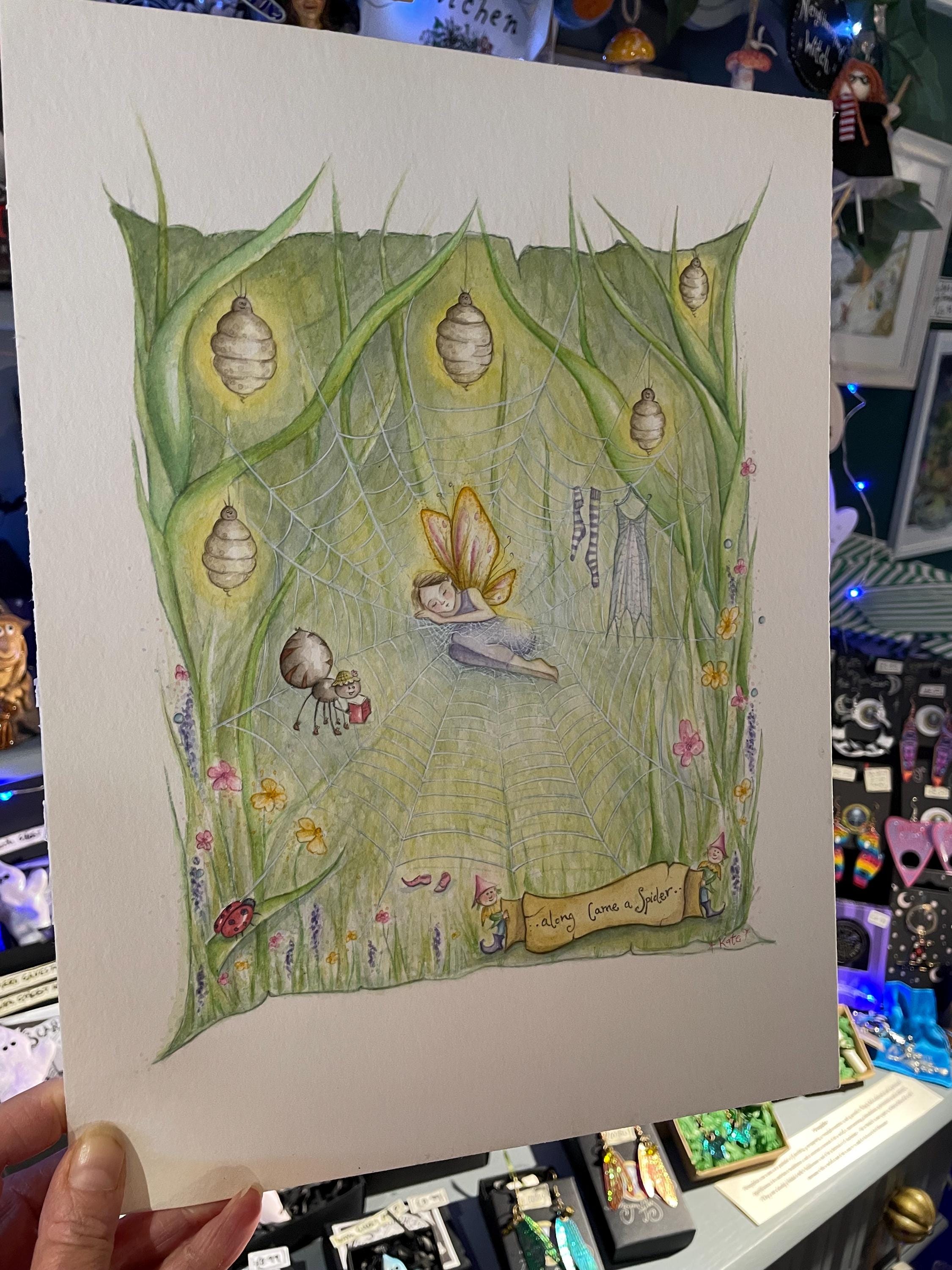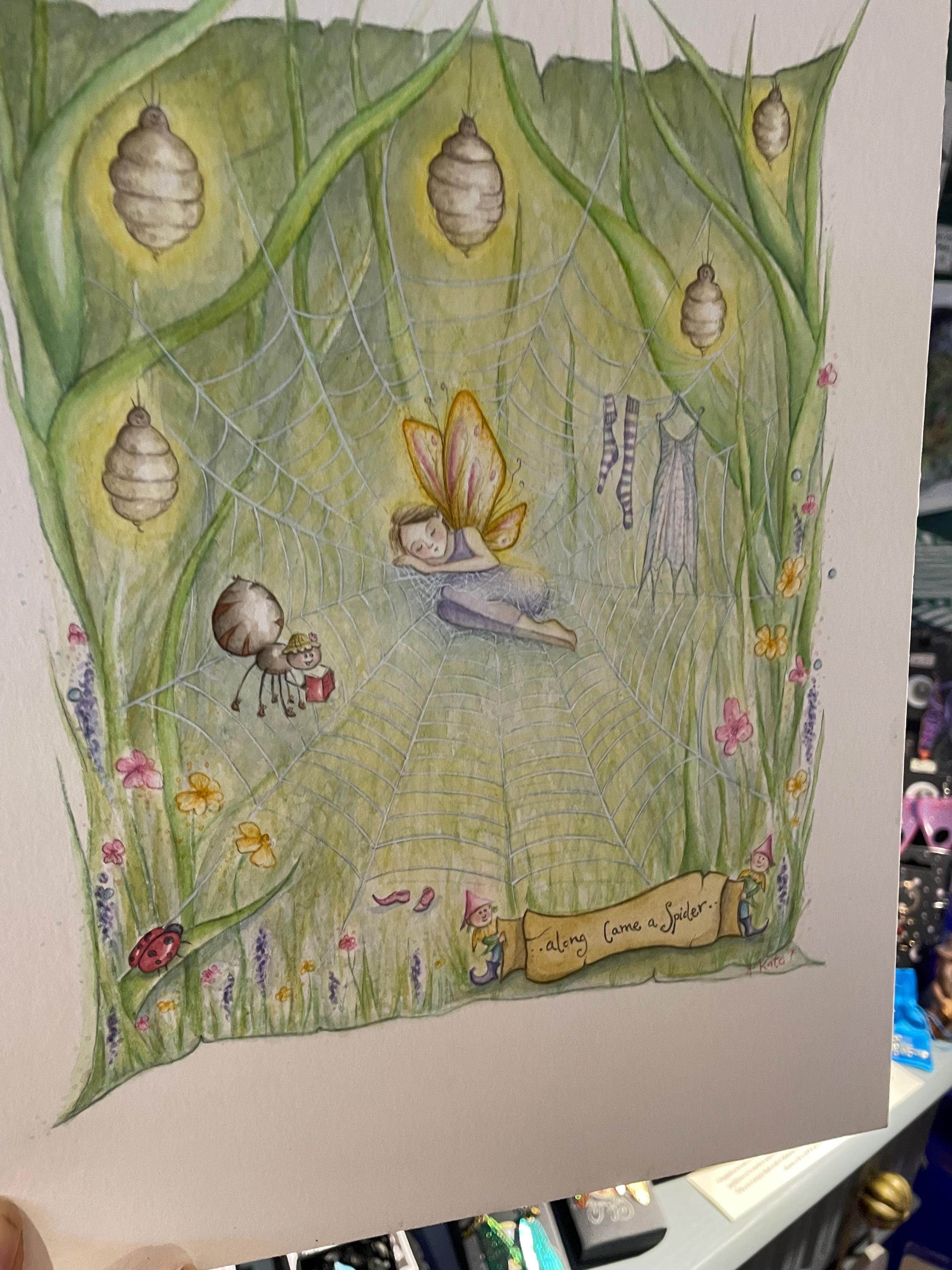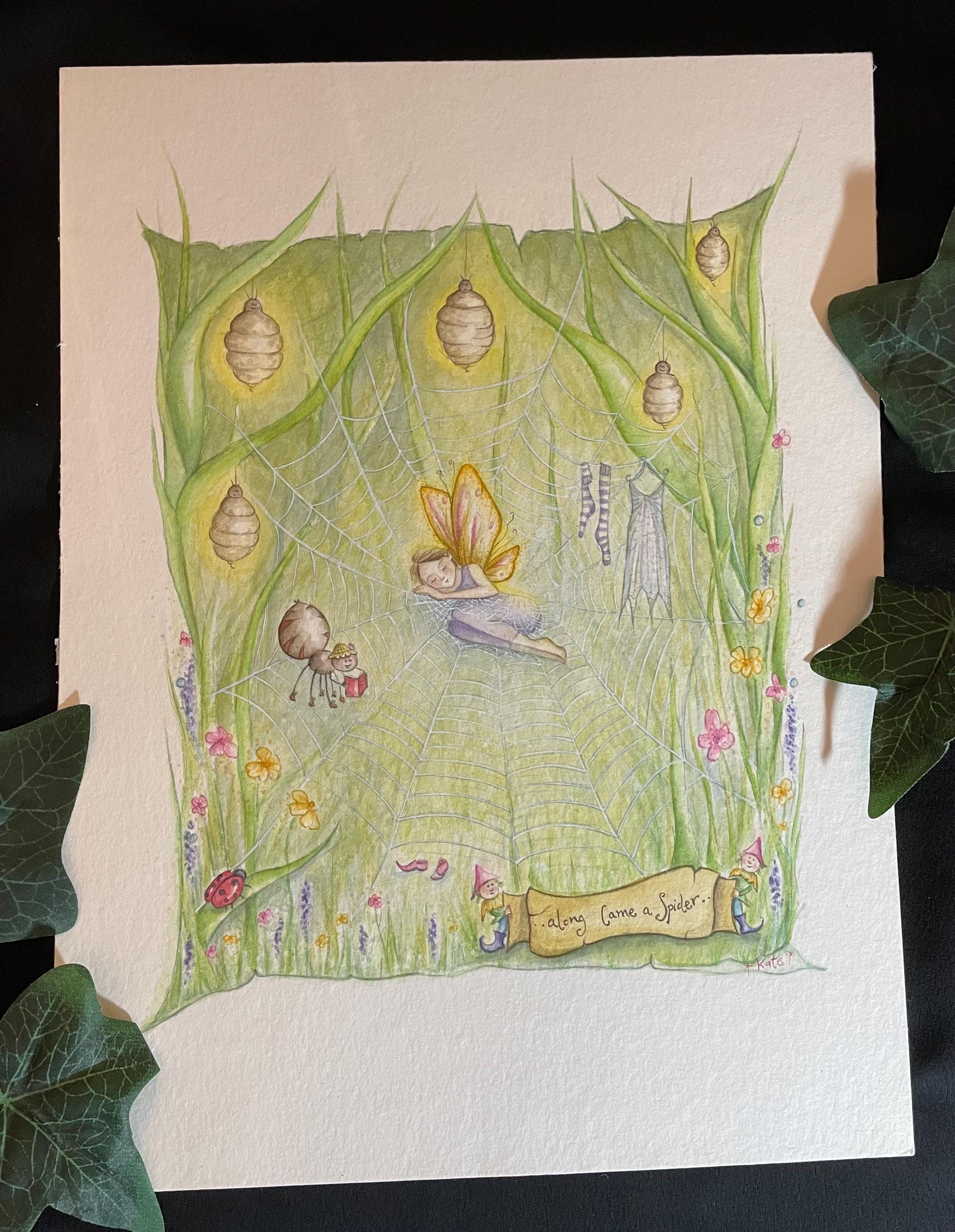 Along came a spider was painted as part of the Enchanted Visions art group monthly themes, every month a new title was set & you had the month to finish & submit the work. My first thoughts for the 'Along came a Spider' theme was to do a Gothic dark image but after some further thought I decided to turn the theme on it's head & used the idea of the 'Along came a spider nursery rhyme' & had the image of the Spider being a gentle caring soul & reading the nursery rhyme to a sleeping fairy