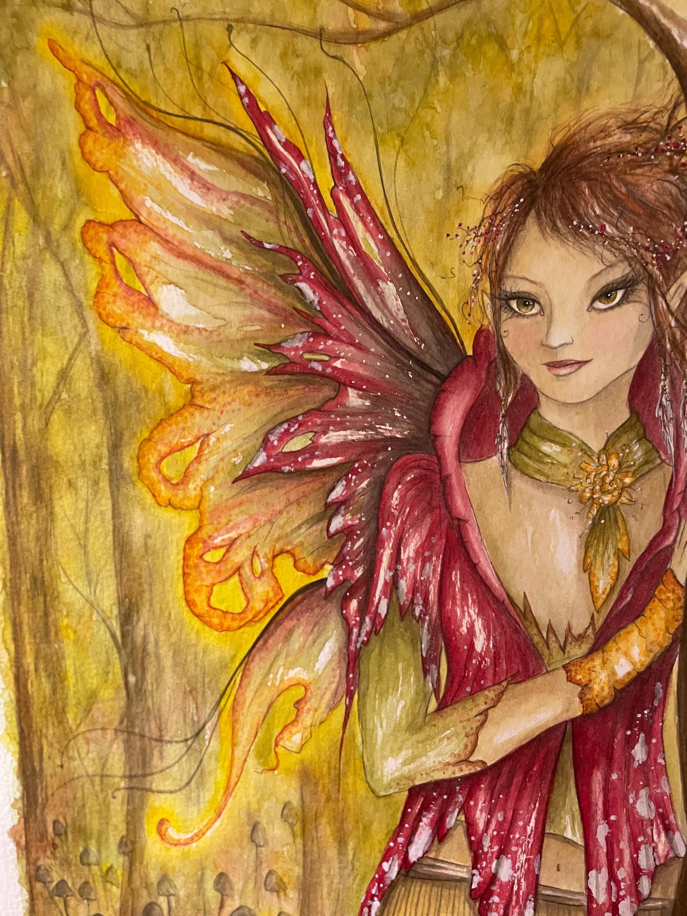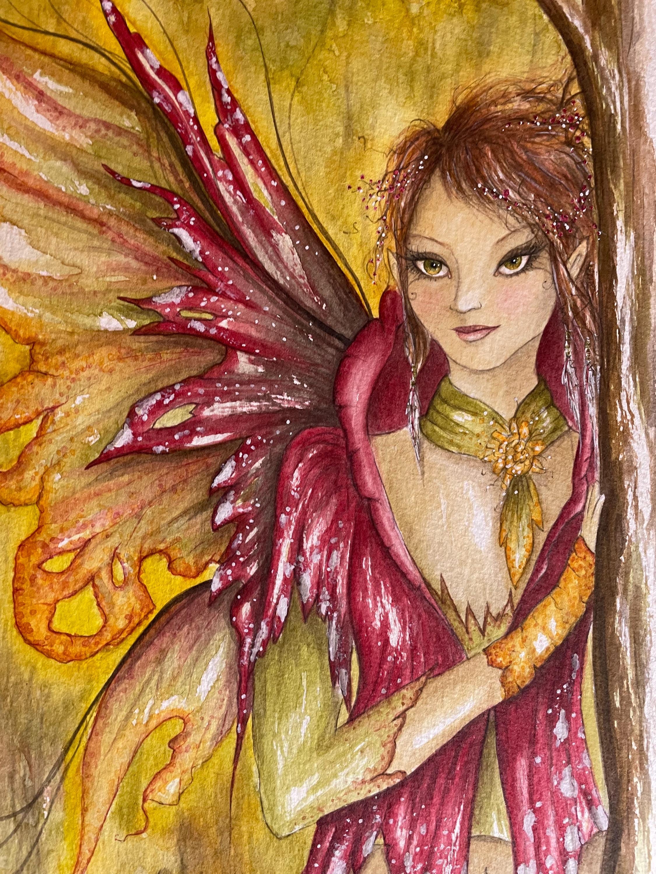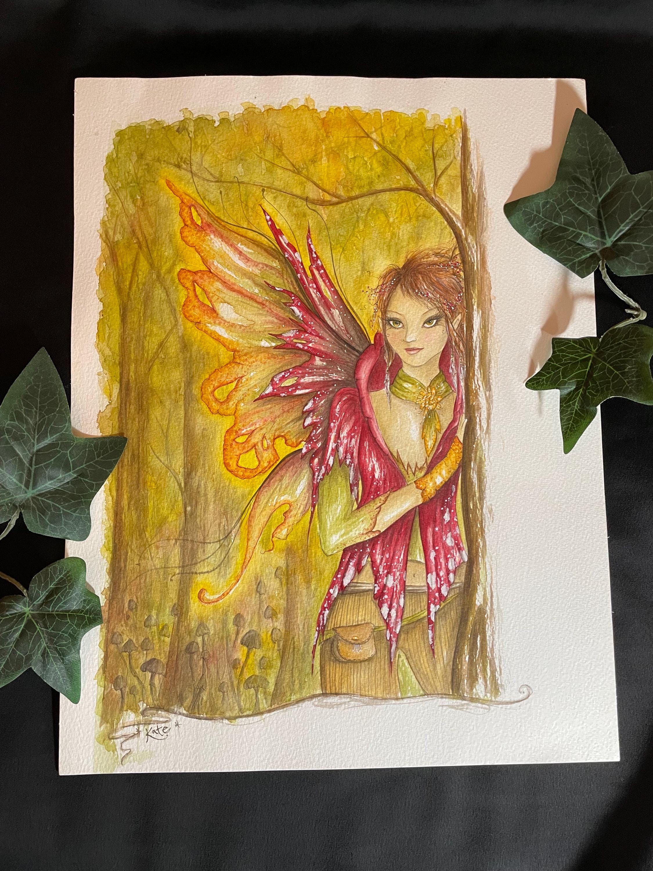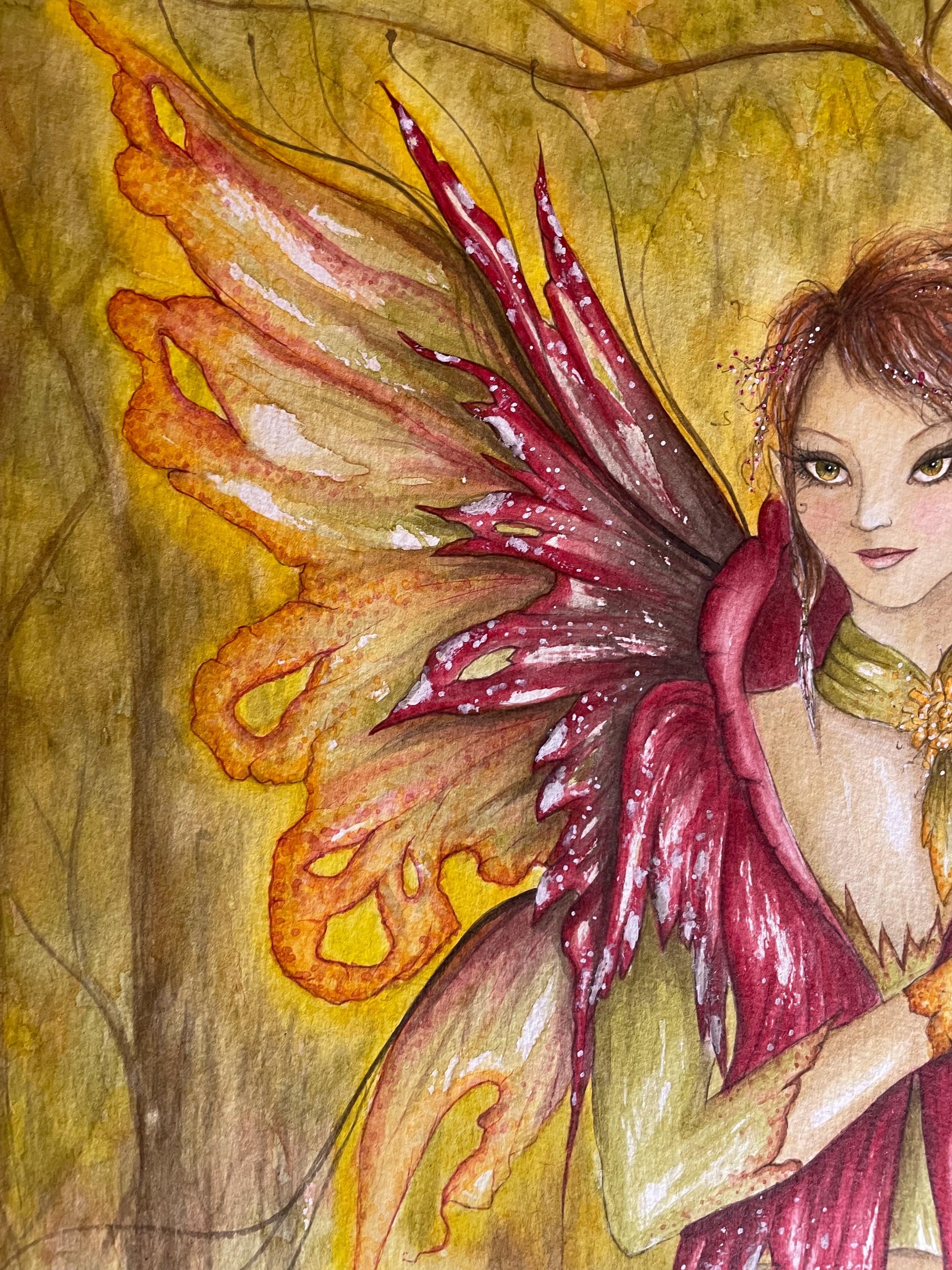 Painted as part of the Enchanted Visions project where a artwork theme was suggested each month, I used the beautiful crimson colour of the fly argaric toadstool as inspiration for this autumnal woodland fairy's outfit