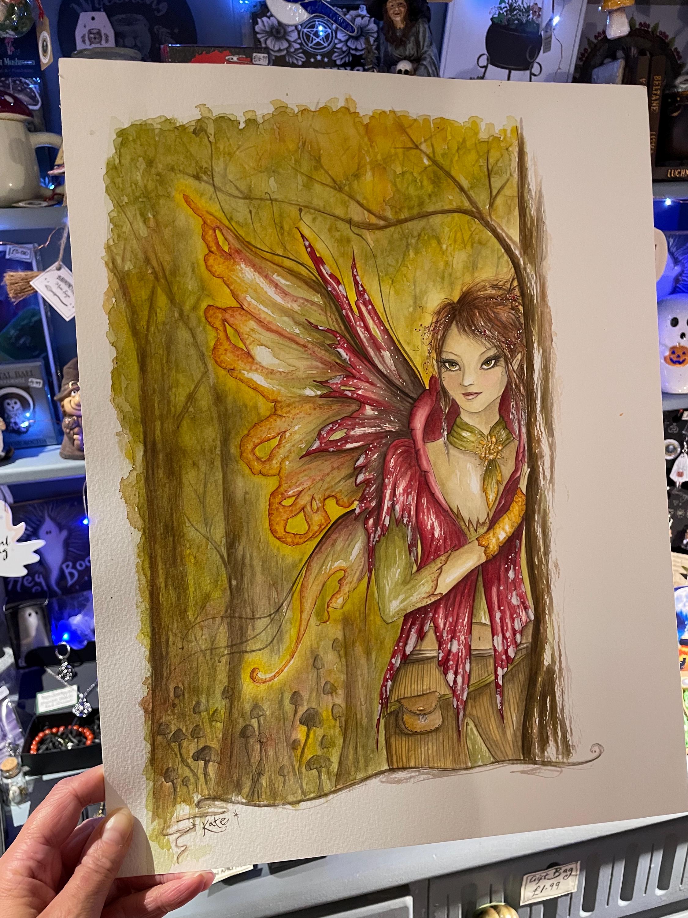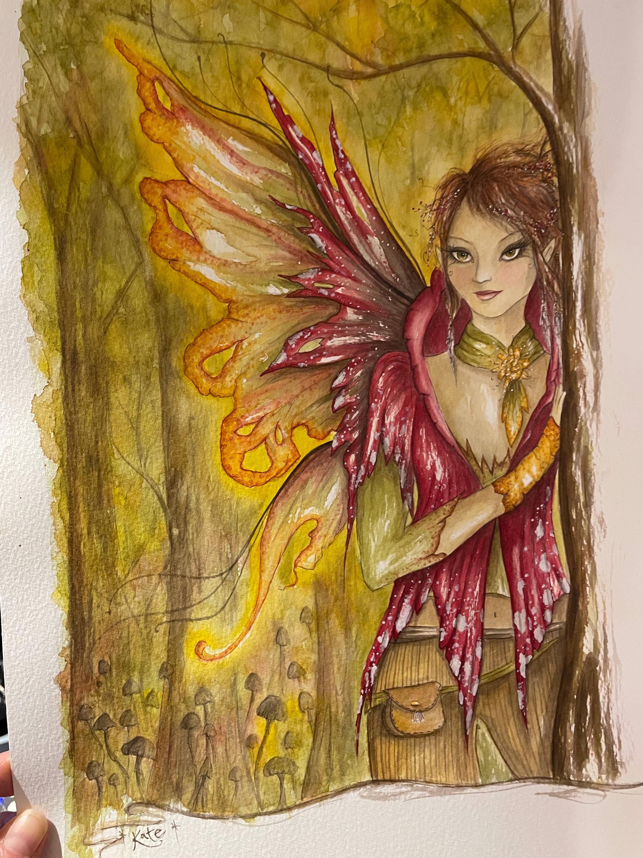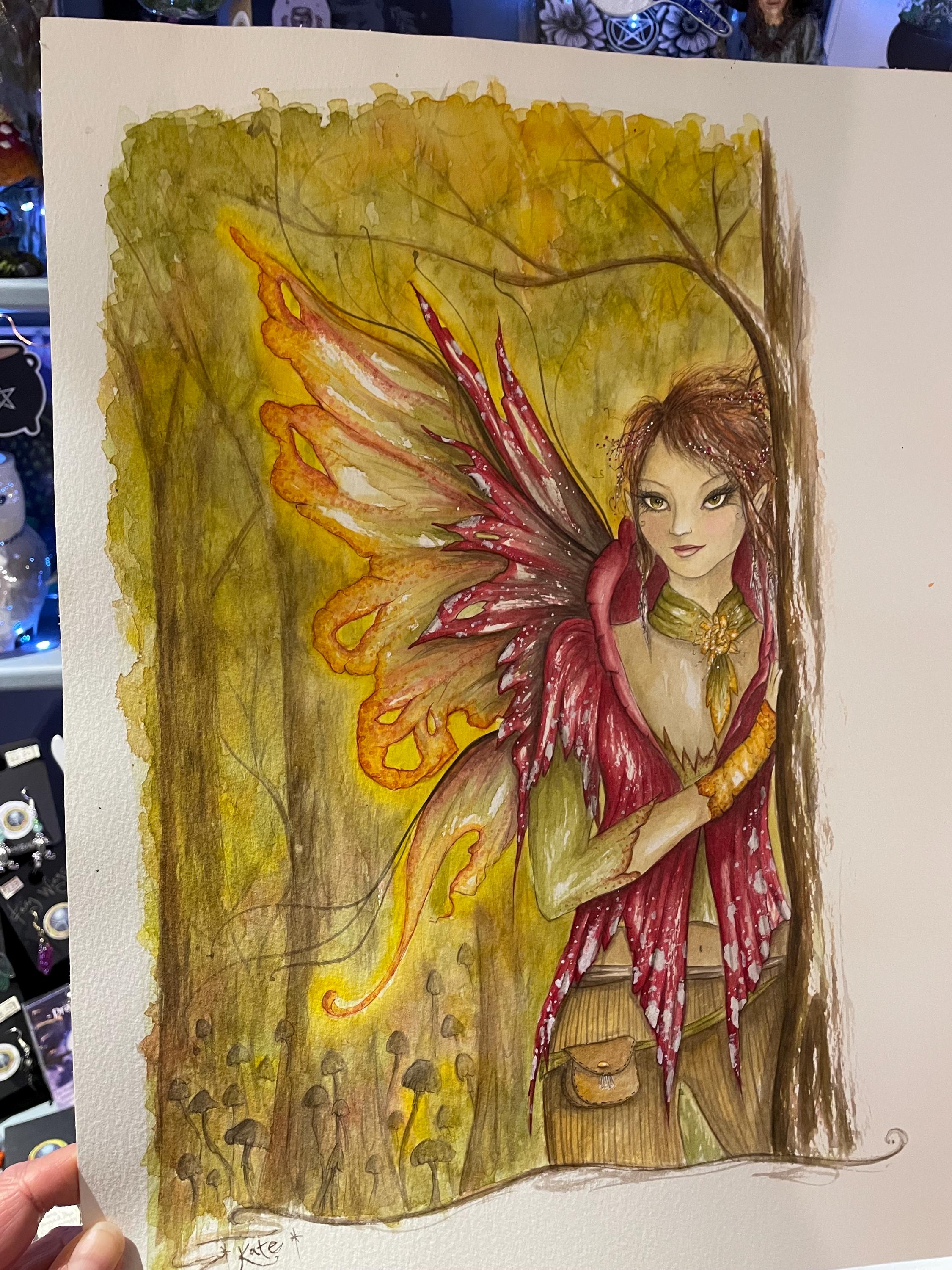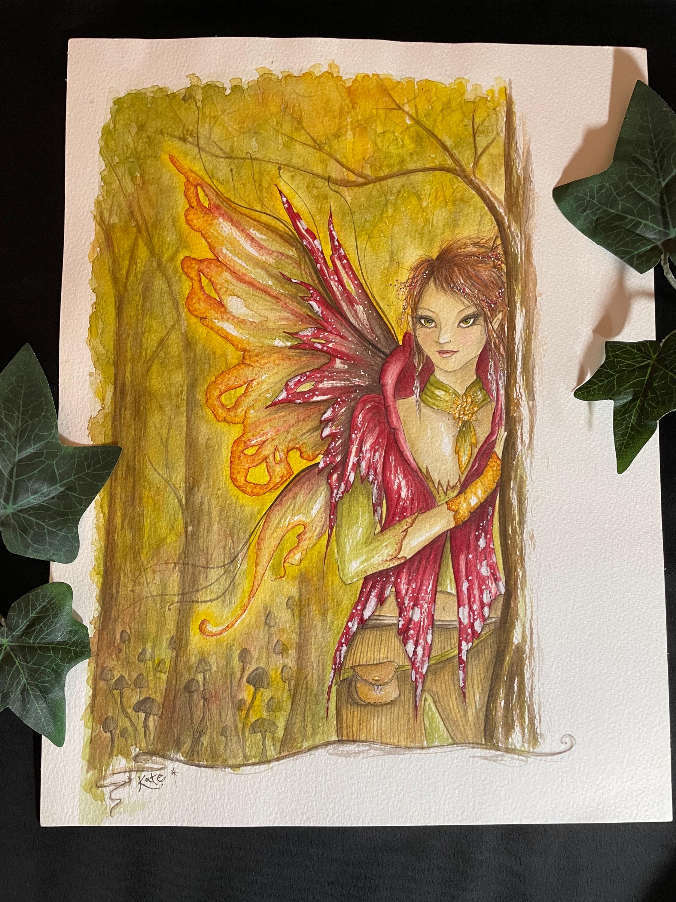 Painted as part of the Enchanted Visions project where a artwork theme was suggested each month, I used the beautiful crimson colour of the fly argaric toadstool as inspiration for this autumnal woodland fairy's outfit